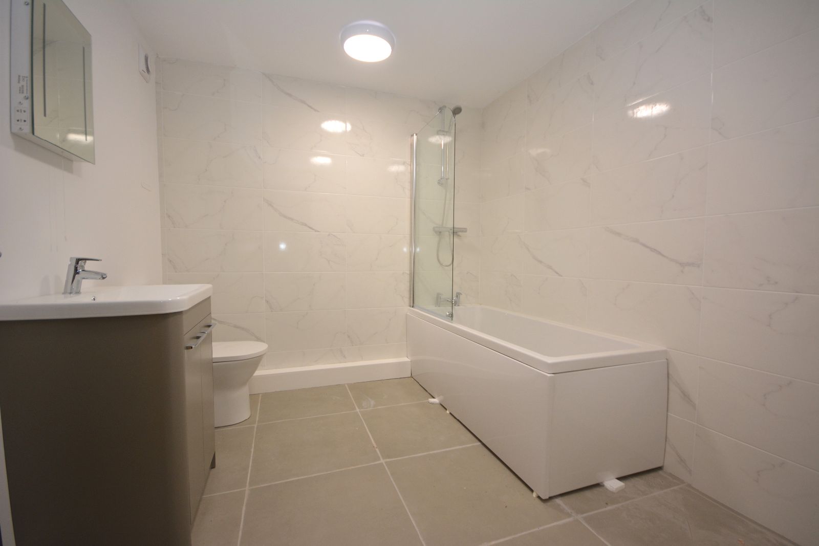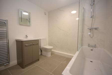 Panelled bath with mains shower and shower screen, extractor fan, vanity wash hand basin unit, low level WC, fully tiled walls, heated towel rail, tiled flooring.