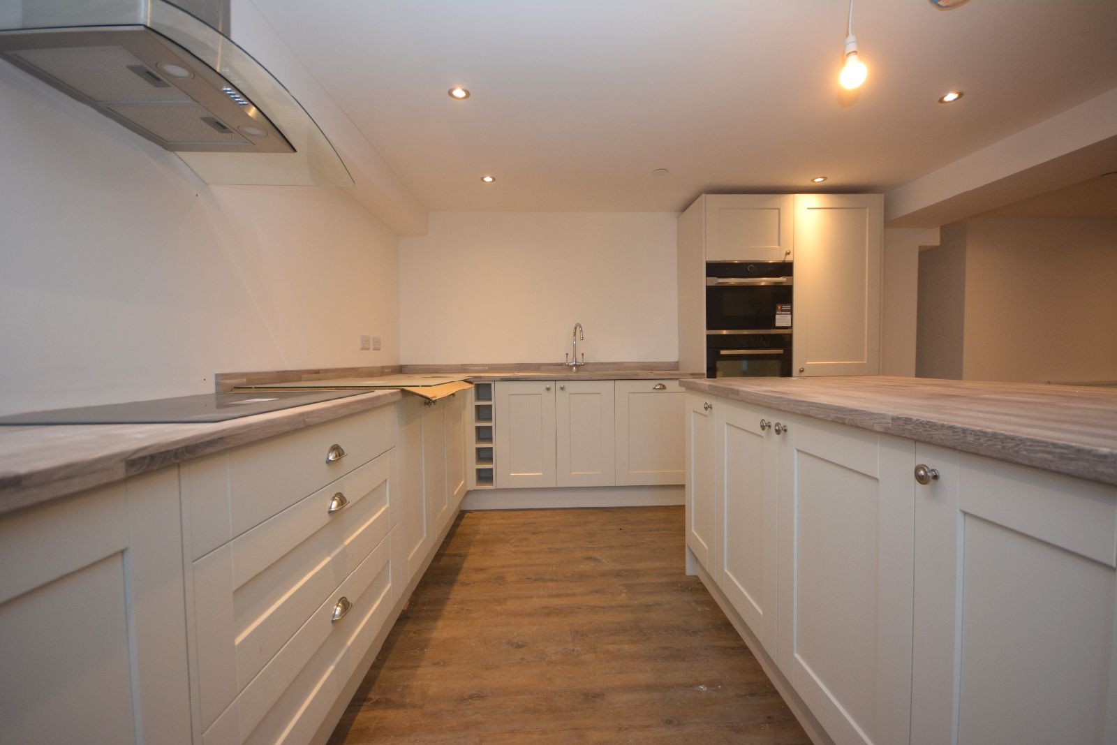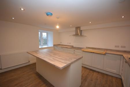 Two windows to front, ceiling downlights, window to rear, open feature fireplace with original bread oven, carpet, fitted kitchen providing 11 base units to include integral dishwasher, under a timber effect worktop, integral fridge freezer, integral 5 ring induction hob with glass splash back and extractor hood above, integral electric single oven and microwave, 1 1/4 stainless steel sink and drainer, central island with 4 base units under a timber effect worktop, 2 radiators, laminate flooring.