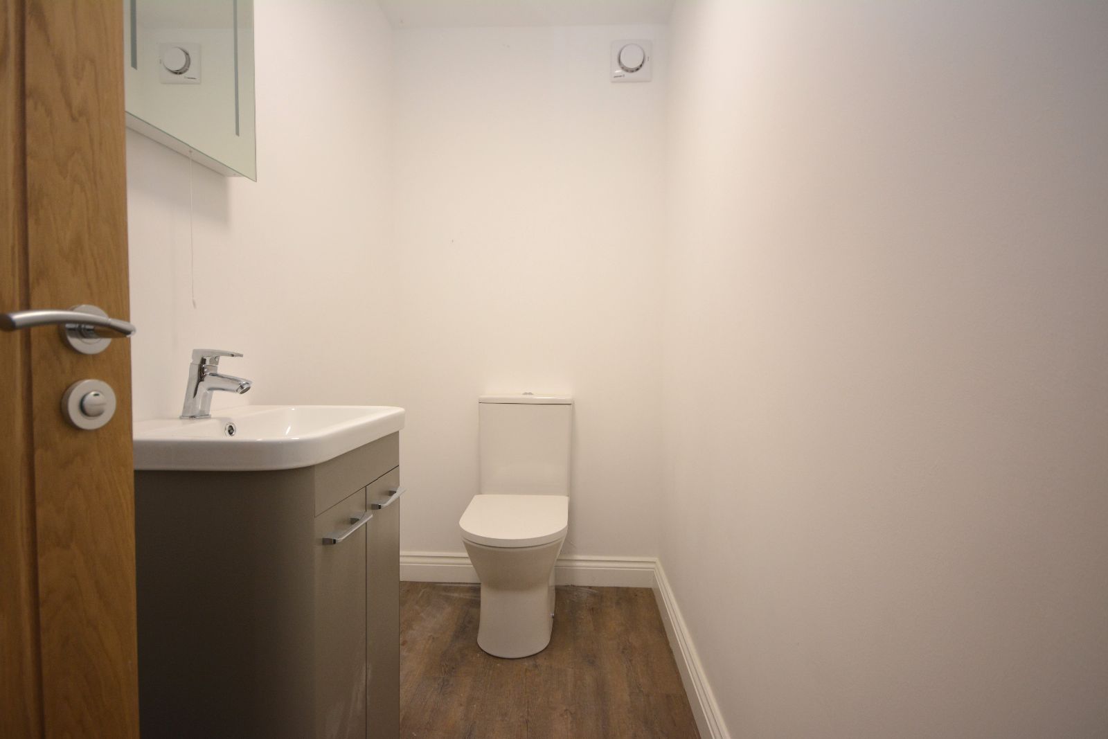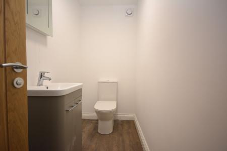 Low level WC, vanity wash hand basin, heated towel rail, laminate flooring.