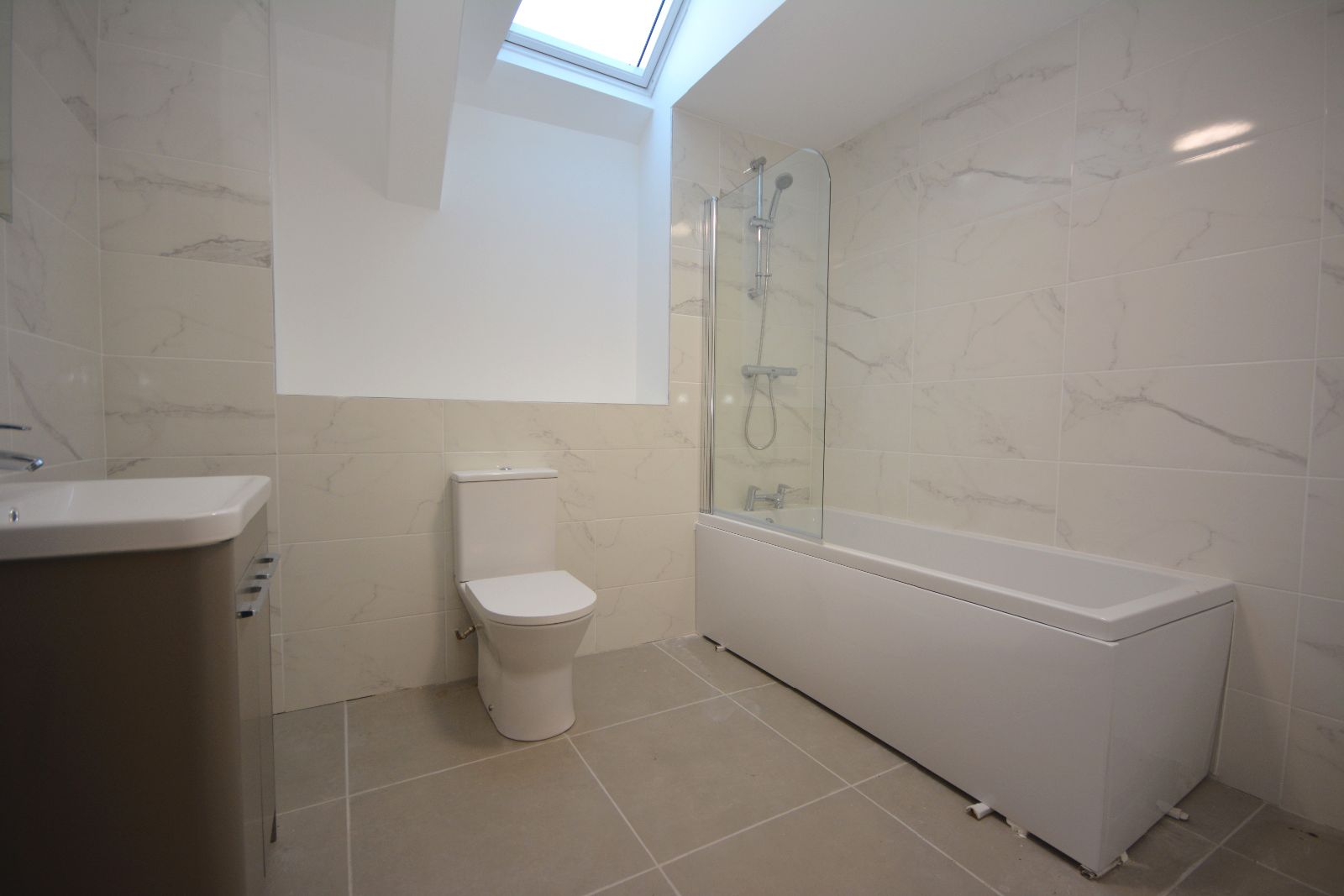 Velux to rear, panelled bath with mains shower and shower screen, extractor fan, vanity wash hand basin, low level WC, fully tiled walls, heated towel rail, tiled flooring.