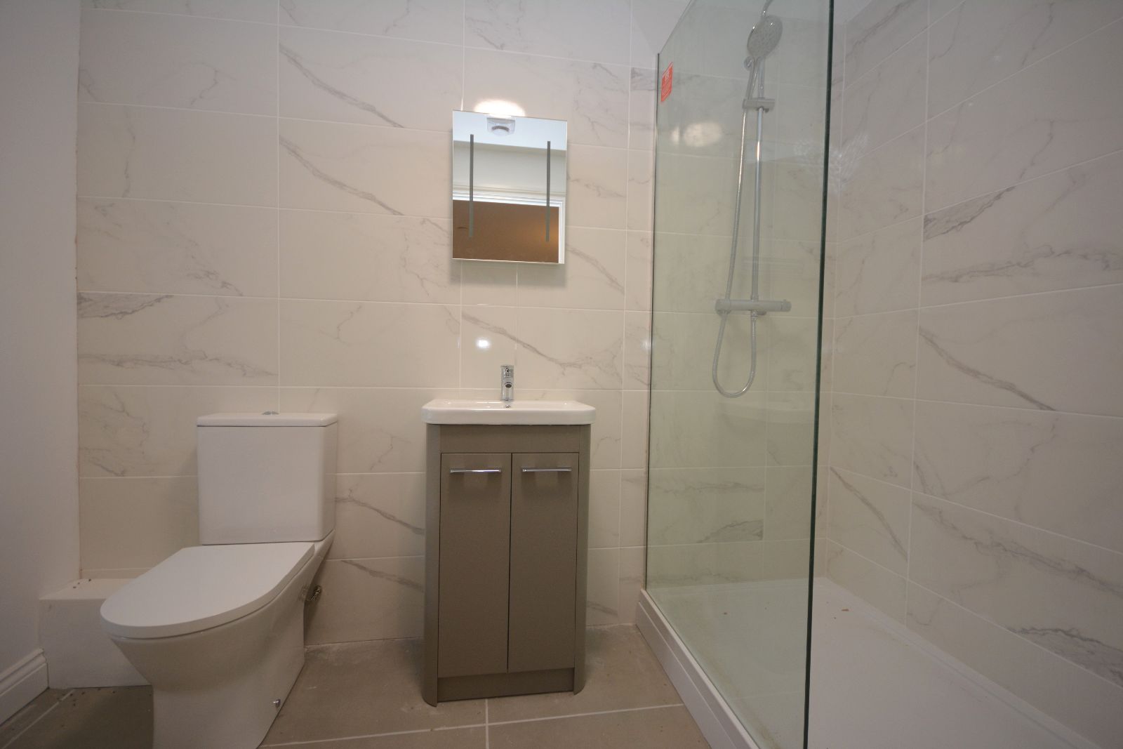 Window to rear, fully tiled walls, shower cubicle with mains shower, extractor fan, vanity wash hand basin unit, LED illuminating mirror, low level WC, heated towel rail, tiled flooring.