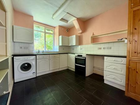 Window to side, access to loft, 4 wall units, 5 base units under a marble effect worktop, washing machine (included in sale), electric cooker (included in sale), space for a fridge, extractor fan, stainless steel sink and drainer, tiled splash back, built in shelving, airing cupboard housing hot water tank, meter cupboard, cushion flooring.
