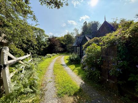 Stone pillared gated driveway leads to the property, providing off road parking. Pathway leads around the property for easy maintenance. Steps leading up to lawn garden with mature trees and shrubs.
