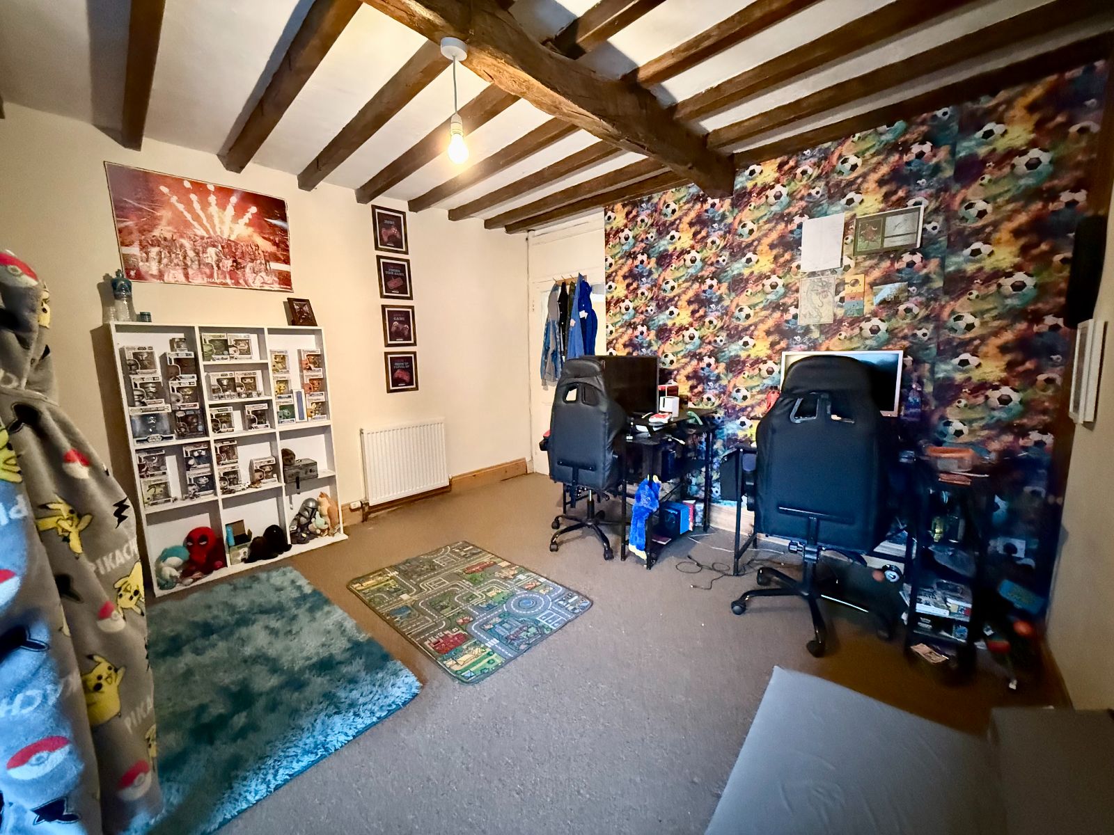 Window to front, exposed beams, built-in cupboard, radiator, carpet.