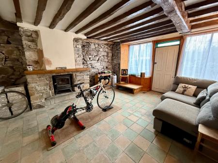 Door to front, 2 windows to front, exposed beams, wall lights, exposed stone open fireplace housing a multi-fuel stove on a slate hearth, 2 radiators, quarry tiled flooring.