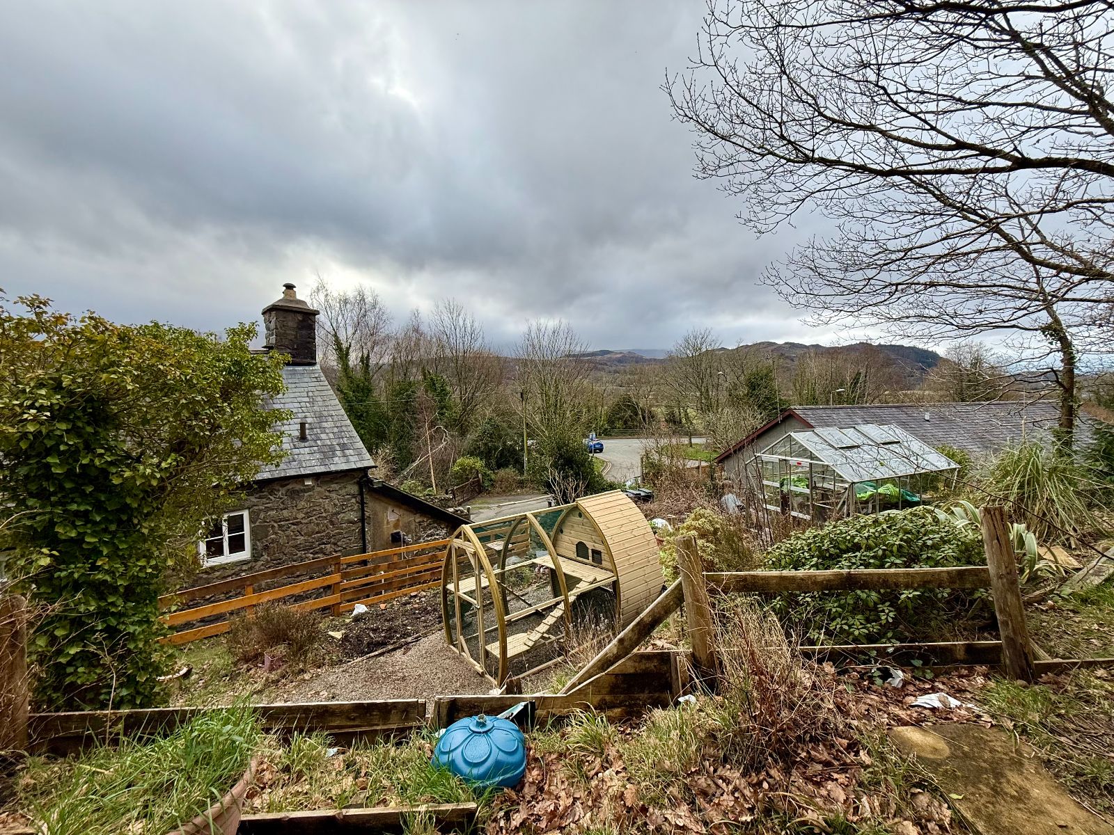 To the rear: Terraced gardens with variety of shrubs and bushes, with summer house, greenhouse, woodstore, raised decking area, enjoying views towards Cader Idris Mountain Range.