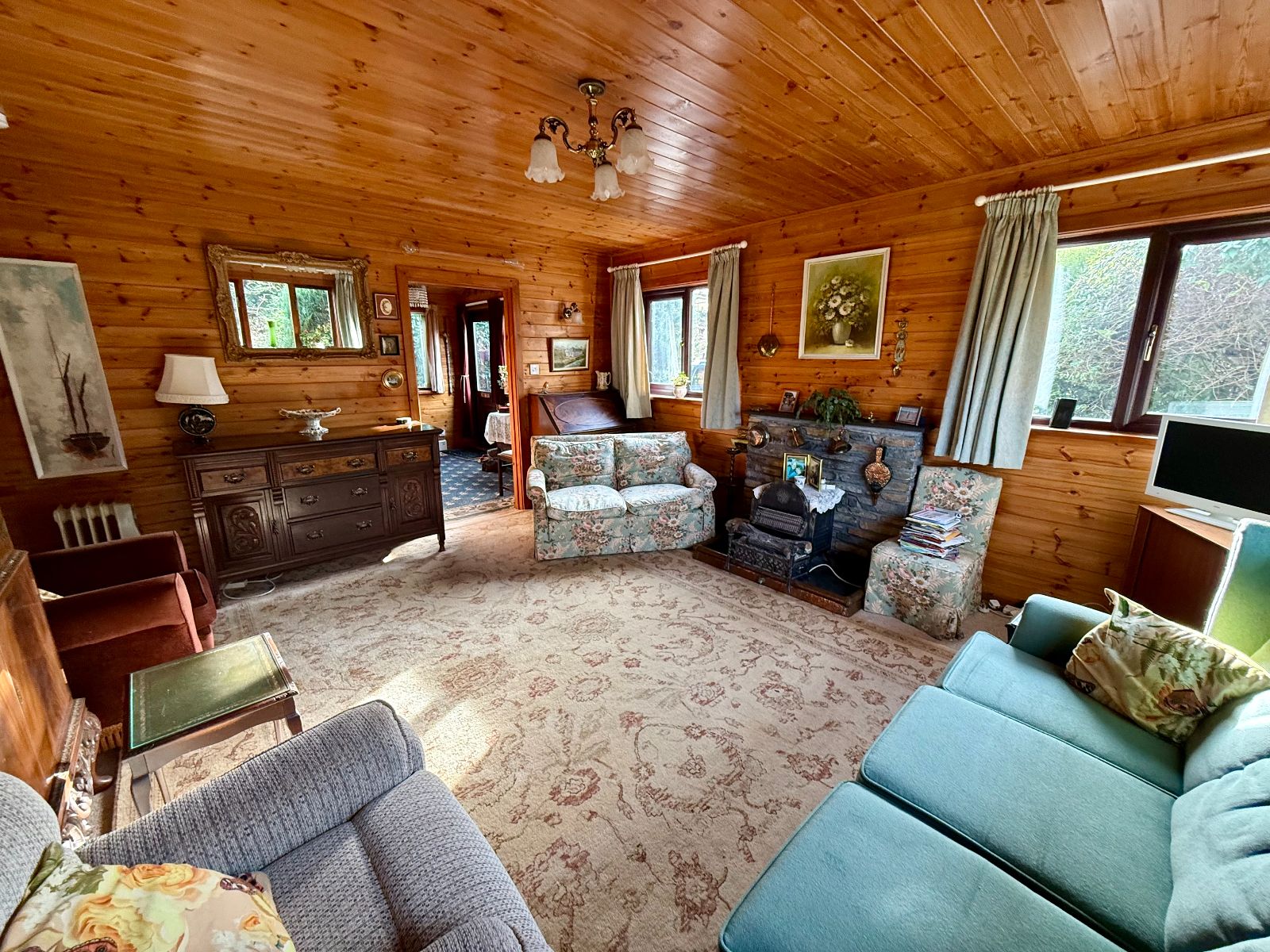 Two windows to front, window to side, wall lights, stone feature fireplace housing wood burning stove on a slate hearth, electric storage heater, carpet.