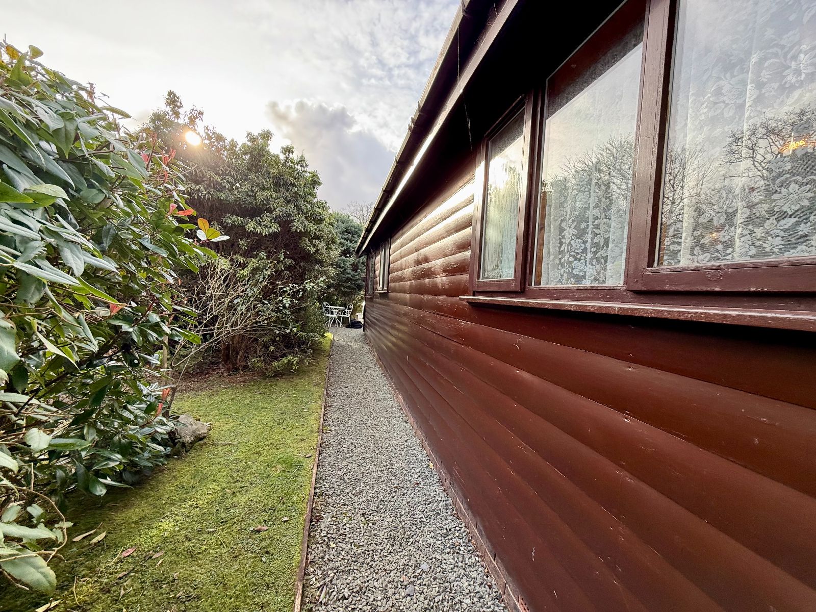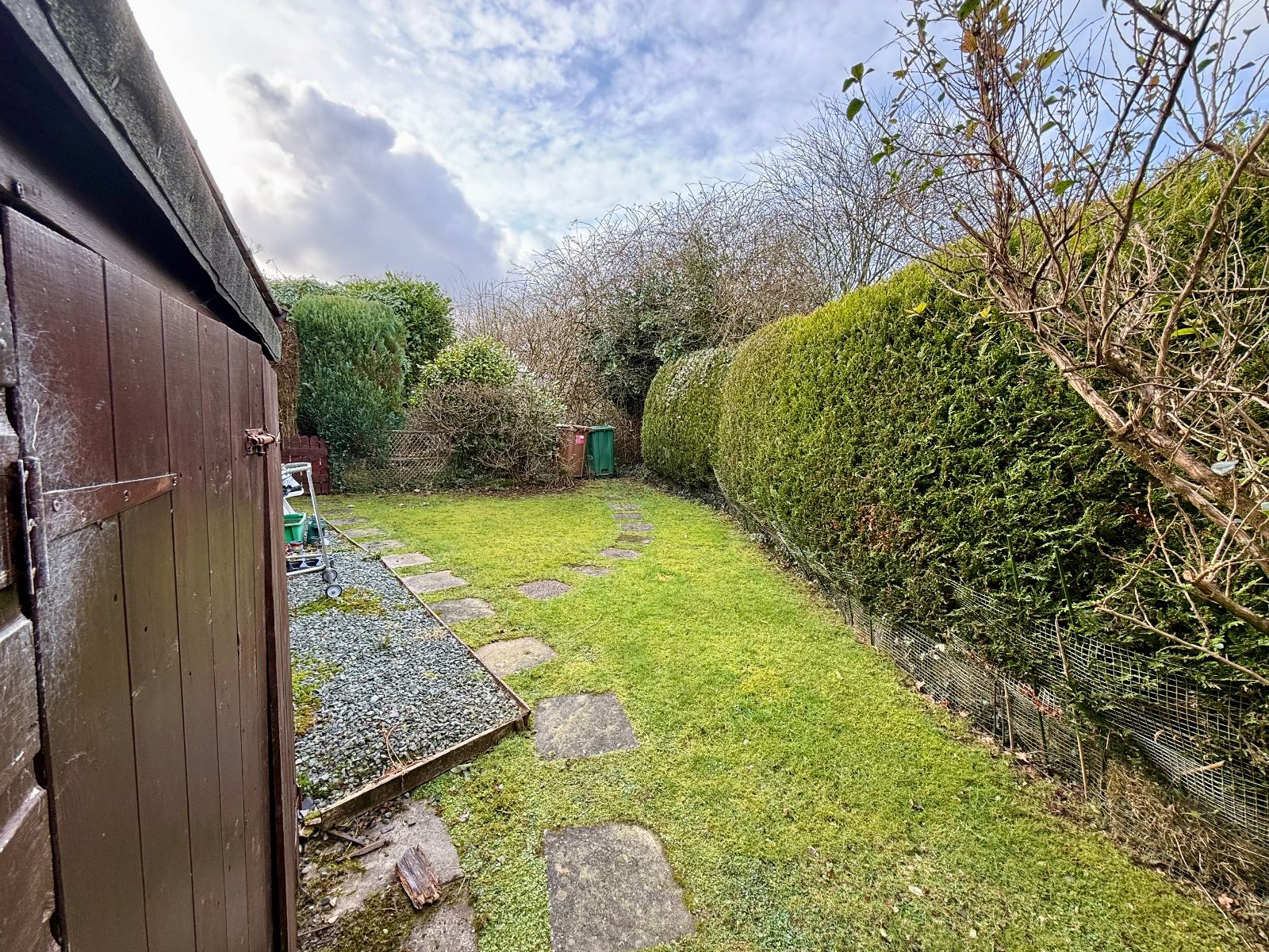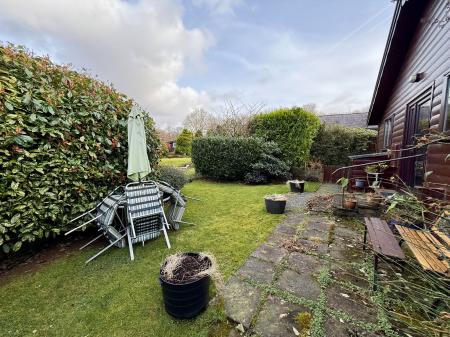 Gravel pathway to one side leading to rear garden with lawn and mature shrubs. Access on the other side of the property to a lawned garden area with access to the rear.