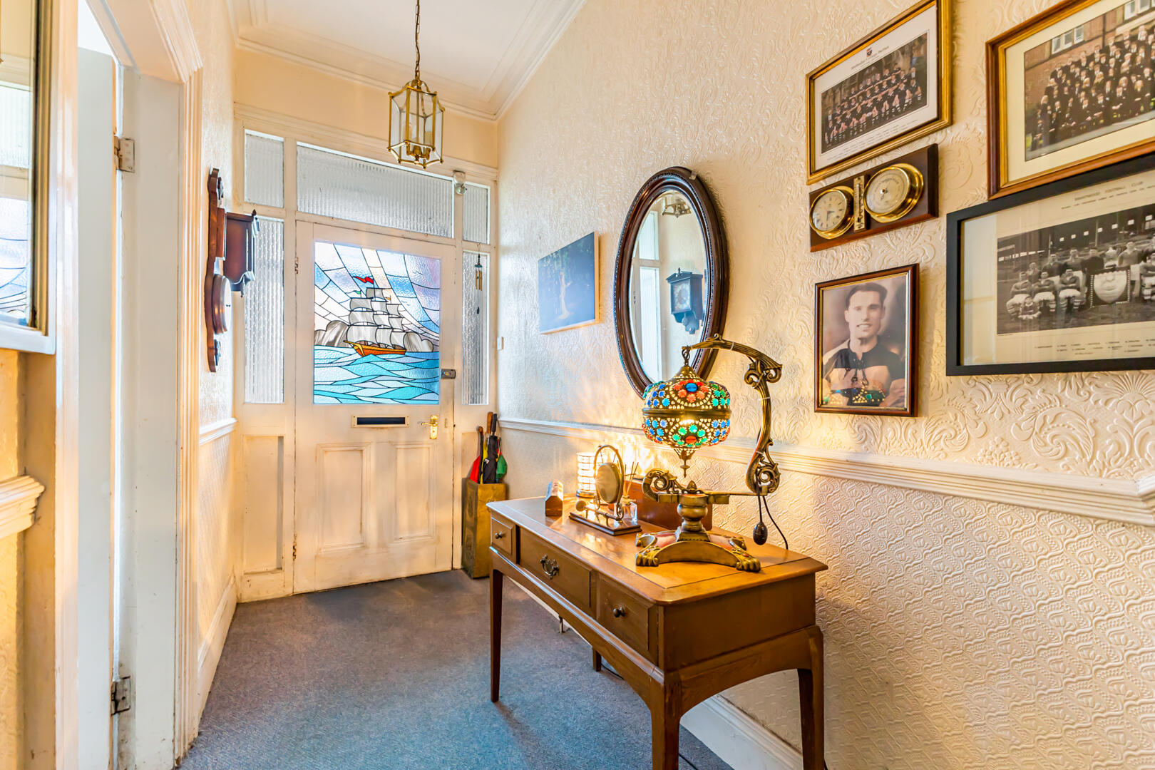 Enclosed Entrance Porch - Fully tiled floor, part tongue and groove walls, cornice ceiling, internal door with stained and leaded glass inset, glazed side panel and over panel to reception hall.