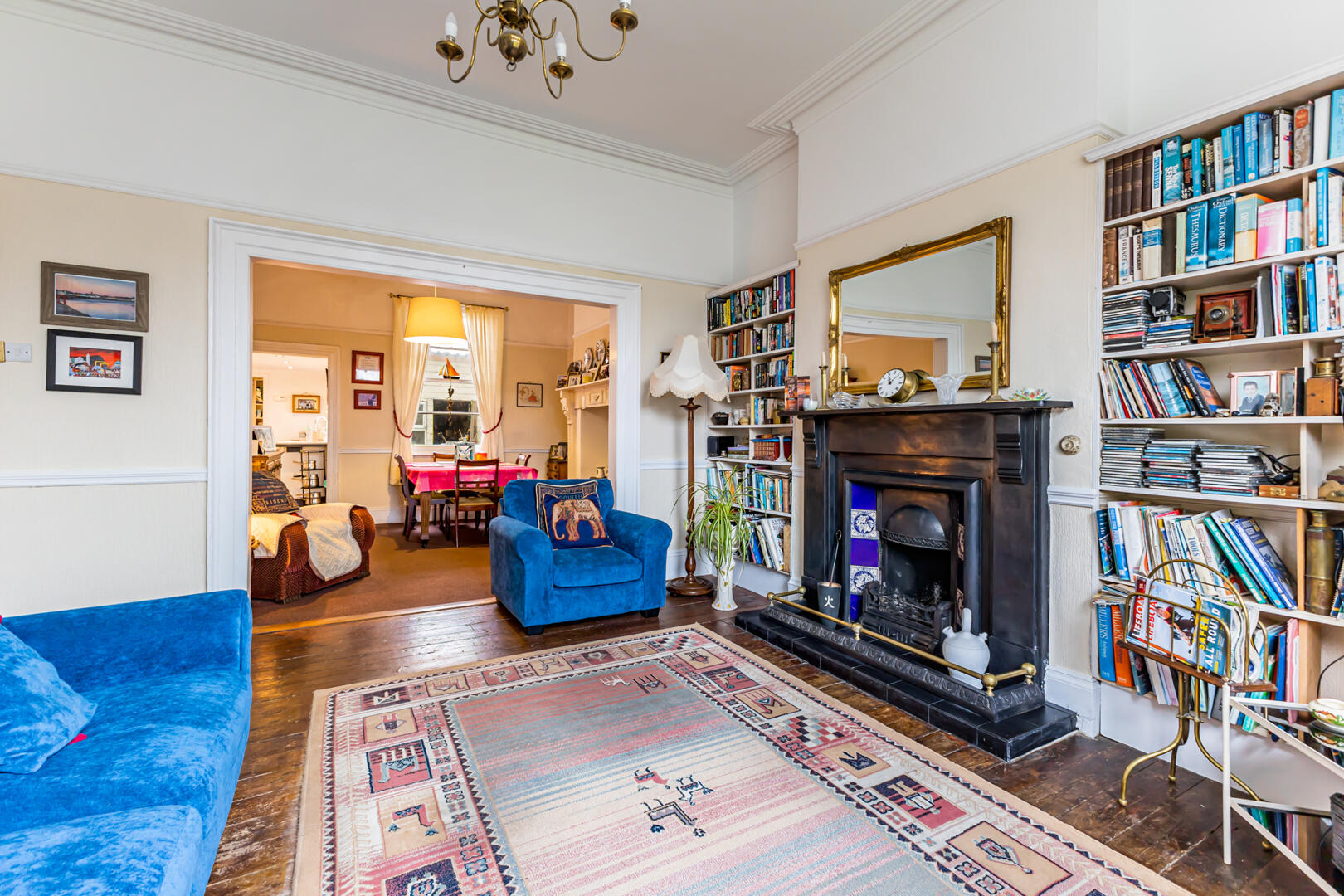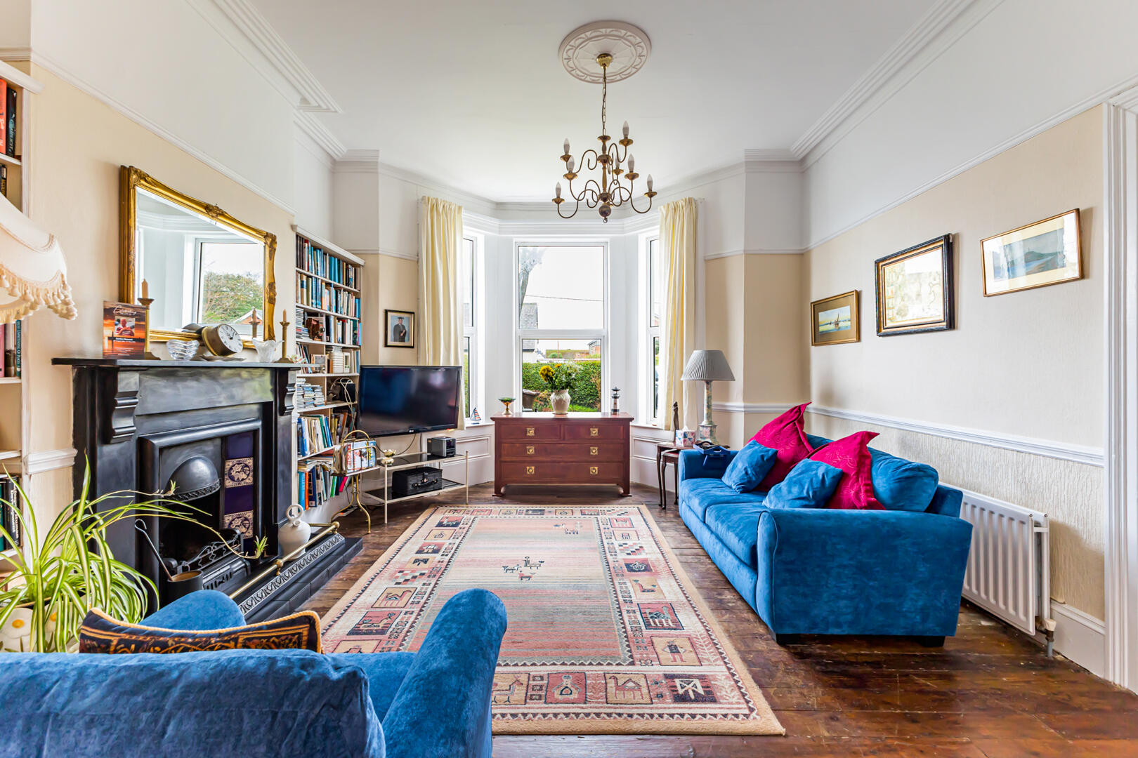Drawing Room Or Bedroom Four - 19'3" x 15'7" - into bay at widest points Views to Donaghadee's iconic lighthouse, harbour and Irish Sea, attractive carved mahogany fireplace surround, cast iron inset, tiled hearth and open fire, cornice ceiling, picture rail, bay window, views to Donaghadee moat.
