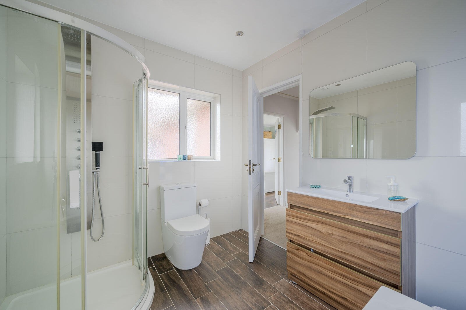 Bathroom - Four piece suite comprising panelled bath with hand shower and mixer tap, separate built-in fully tiled shower cubicle with power jets, wash hand basin with mixer tap, storage beneath, low flush WC, fully tiled floor, part tiled walls, heated towel rail, extractor fan.