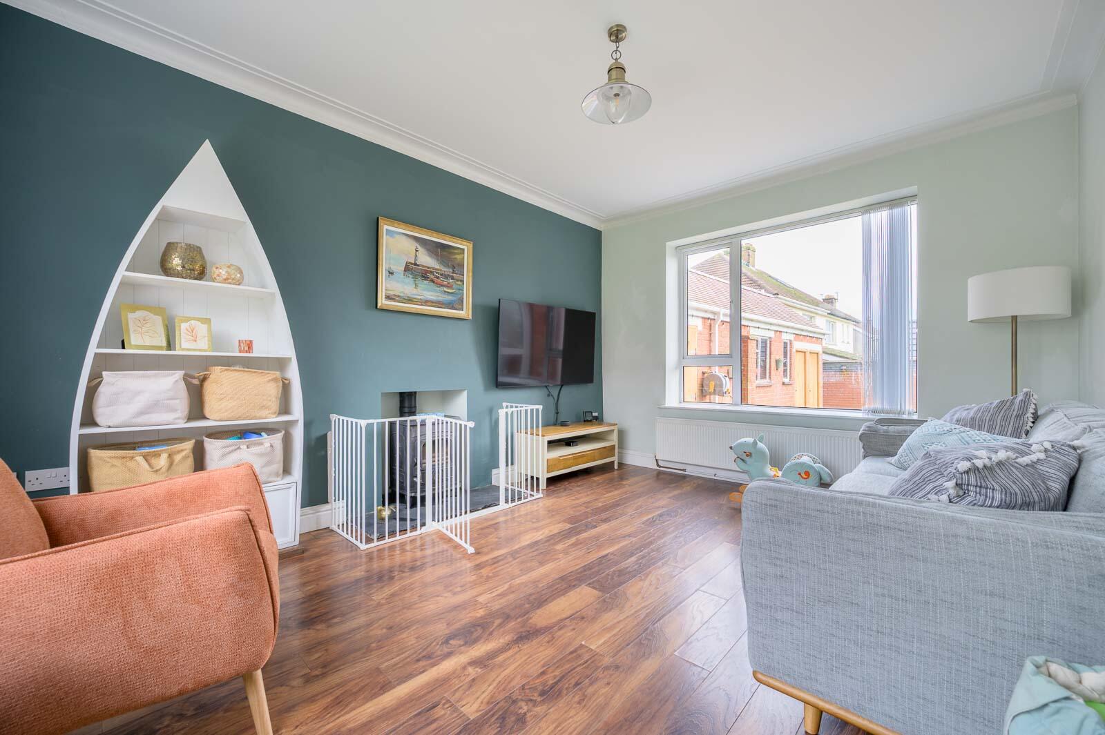Living Room - 14'2" x 11'2" - Cast iron wood burning stove, slate hearth, laminate wood effect floor, cornice ceiling.