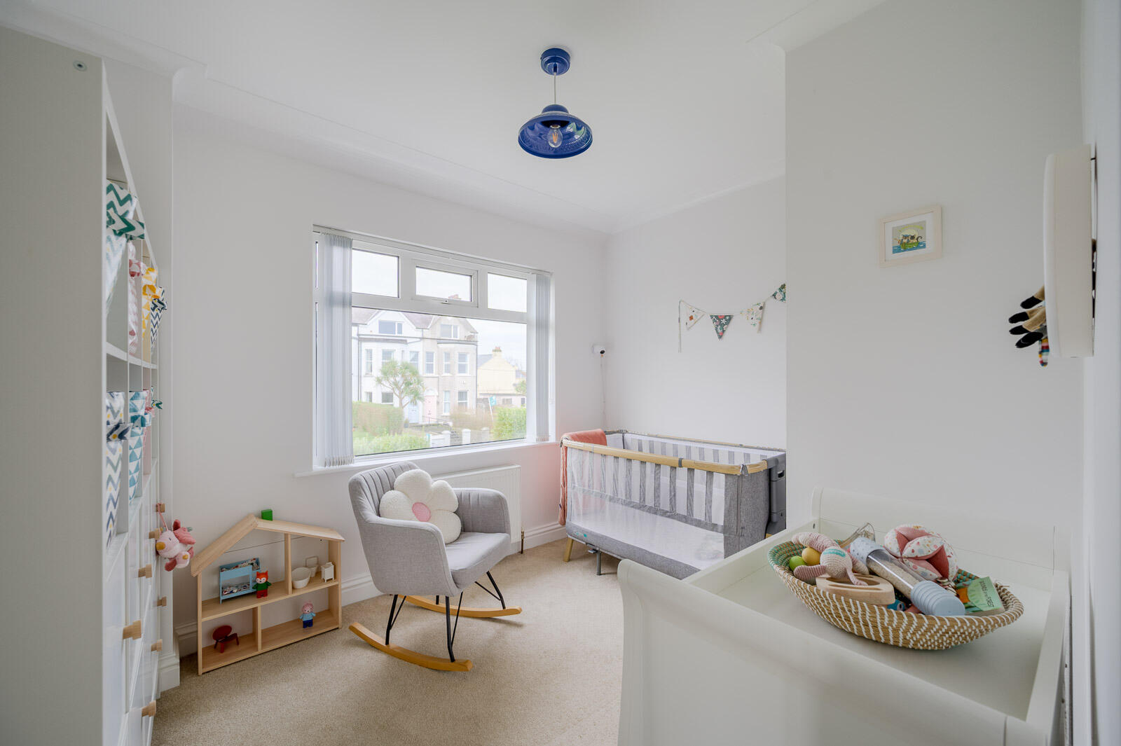 Cornice ceiling, built-in shelved wardrobe.