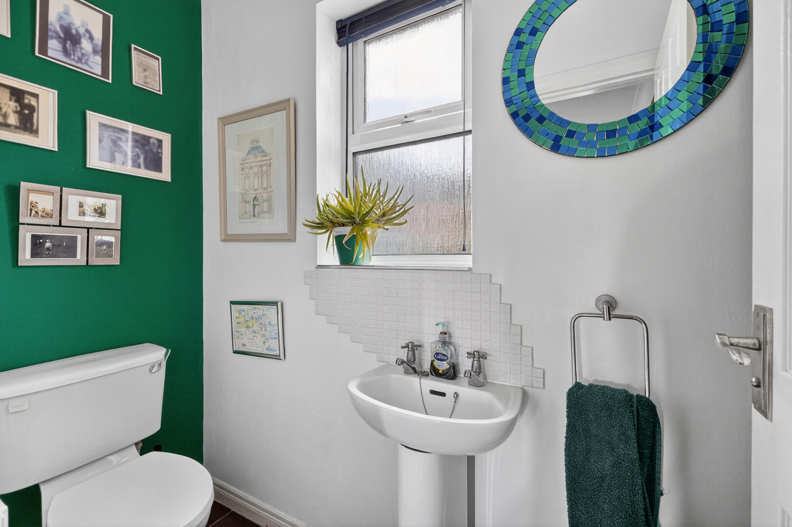 Downstairs Wc - Two piece white suite comprising low flush WC, pedestal wash hand basin, tiled splashback, fully tiled floor.