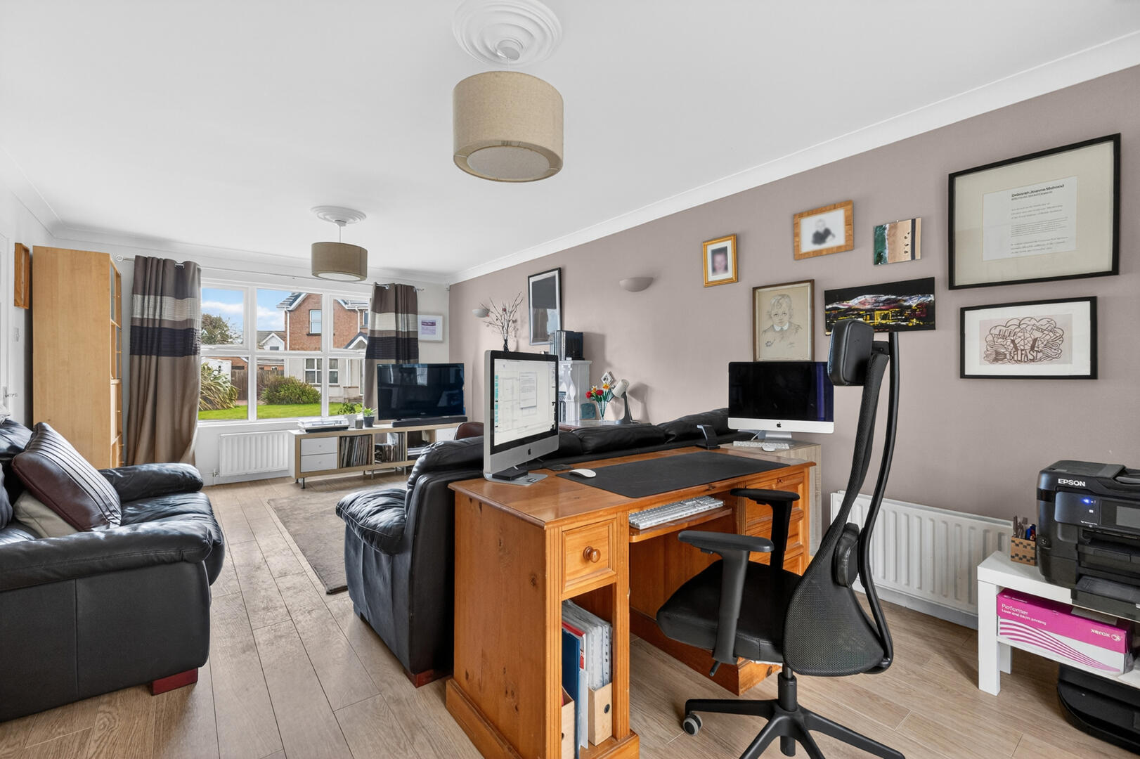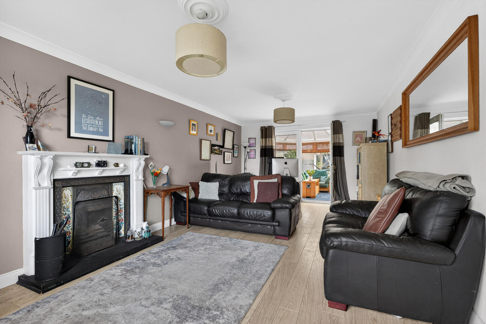 Living / Dining Room - 22'1" x 12'3" - Attractive carved wooden fireplace surround, cast iron tiled inset, slate hearth, open fire, laminate wood effect floor, cornice ceiling, ceiling roses, uPVC double glazed French doors to conservatory.