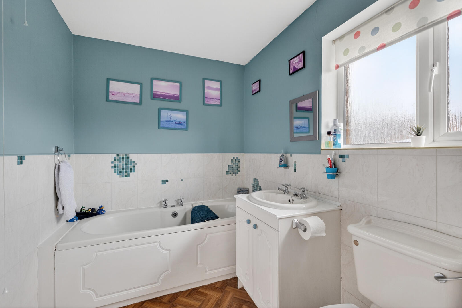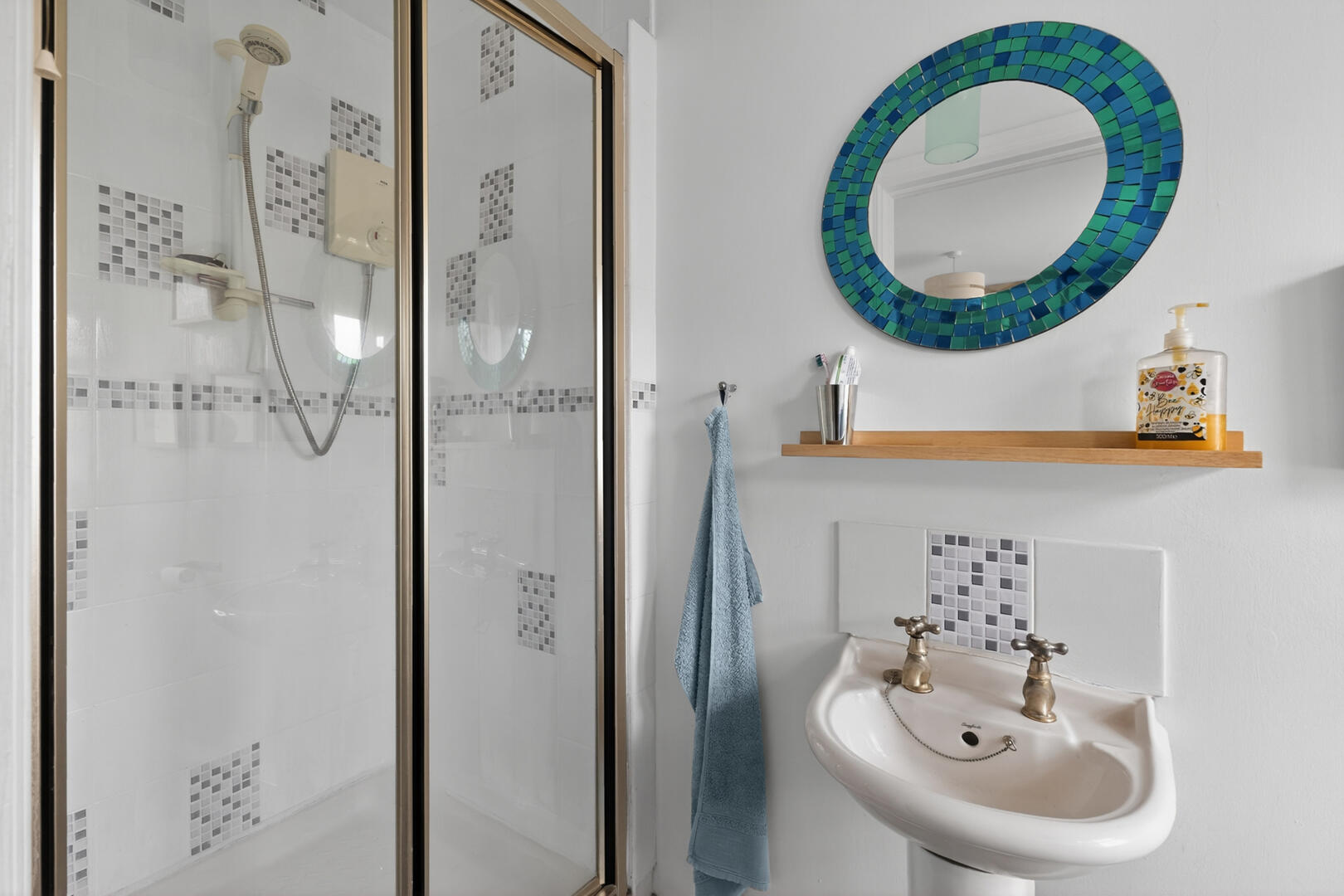 Bathroom - Four piece suite comprising panelled bath, separate built-in fully tiled shower cubicle, wash hand basin with mixer tap, storage beneath, low flush WC, part tiled walls.