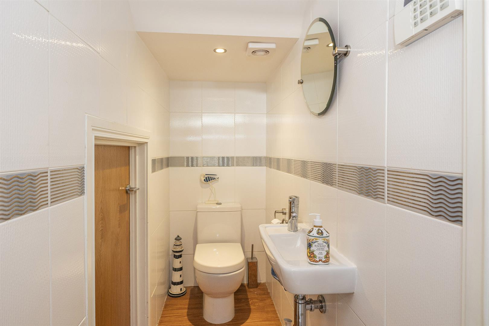 Downstairs Wc: - () - Two piece white suite comprising low flush WC, wash hand basin, fully tiled walls, storage under stairs, extractor fan.