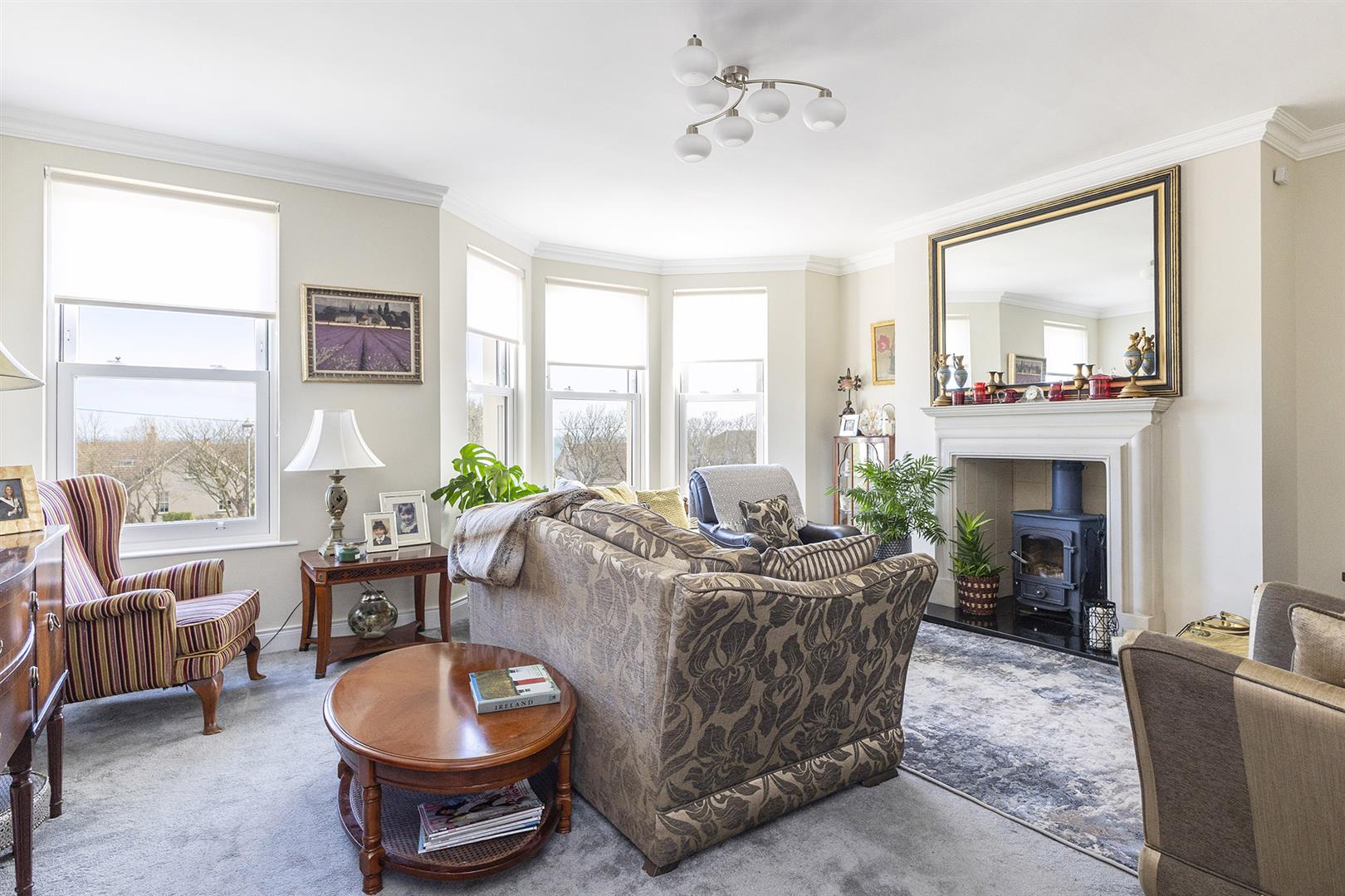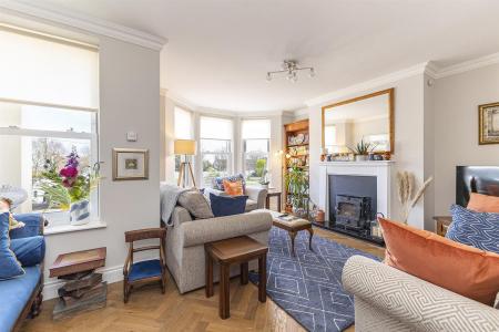 Attractive fireplace, slate surround, granite hearth, cast iron wood burning stove, cornice ceiling, herringbone wood parquet flooring, views to Irish Sea.