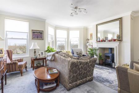 .First Floor Drawing Room with Stunning Sea Views, Attractive Polished Limestone Fireplace and Wood Burning Stove