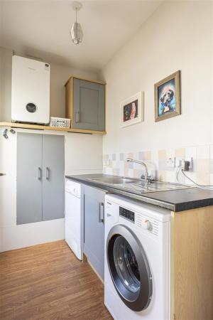 Utility Room: - () - Storage cupboards, granite effect work surfaces, single bowl single drainer stainless steel sink unit, plumbed for washing machine, space for tumble dryer, gas fired boiler, extractor fan, part tiled walls, uPVC double glazed door to outside.