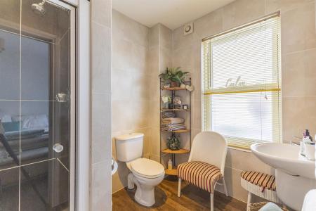 Ensuite Shower Room: - () - Comprising walk-in shower cubicle, wash hand basin, mixer tap on display, low flush WC, fully tiled floor, extractor fan, fully tiled walls.