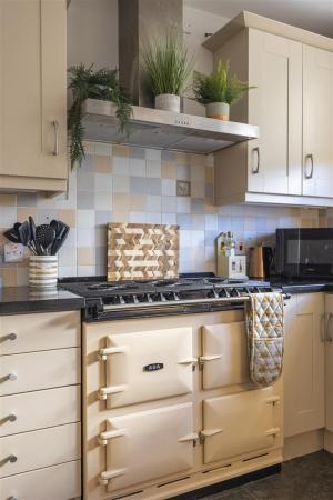 Range of high and low level Shaker style units, granite work surfaces, Franke one and a half bowl under counter sink unit with matching granite drainer, mixer tap, space for cooker range, tiled splashback, extractor fan above, space for fridge freezer, integrated dishwasher, pull-out pantry cupboard, glass display cabinets, concealed strip lighting, part tiled walls, casual dining/family area with feature vaulted ceiling, cast iron wood burning stove and uPVC double glazed French doors to outside.
