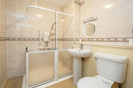 Wet Room - () - White suite comprising: shower cubicle with Mira Sport electric shower unit, pedestal wash hand basin with mixer tap, low flush WC, fully tiled walls, extractor fan.