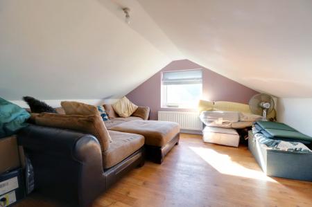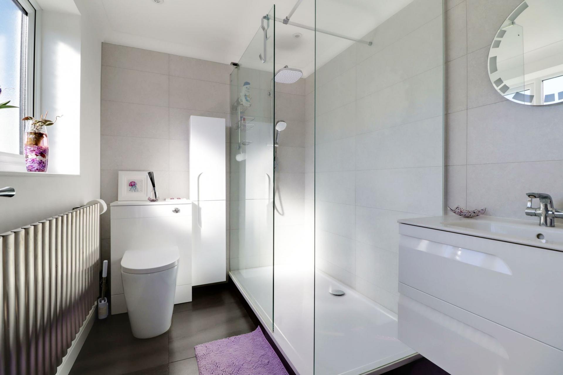 With a rear uPVC double glazed window with patterned glazing providing a suite in white comprising a close couple low flush WC, vanity wash hand basin and a large shower cubicle with glazed surround and mains shower, cermaic tiled flooring, two fully tiled walls, stylish stainless steel style radiator, wall to ceiling coving, inset ceiling spotlights and extractor.