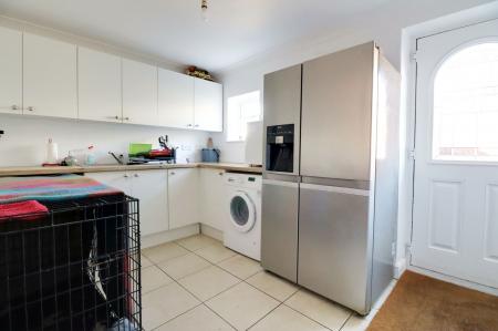 Side composite double glazed entrance door with inset patterned glazing, side uPVC double glazed window with obscured glazing, an extensive range of white fronted base and wall units with button pull handles with a complementary wooden style worktop incorporating a one and a half bowl stainless steel sink unit with drainer to the side and block mixer tap, space and plumbing for appliances, tiled flooring and wall to ceiling coving.