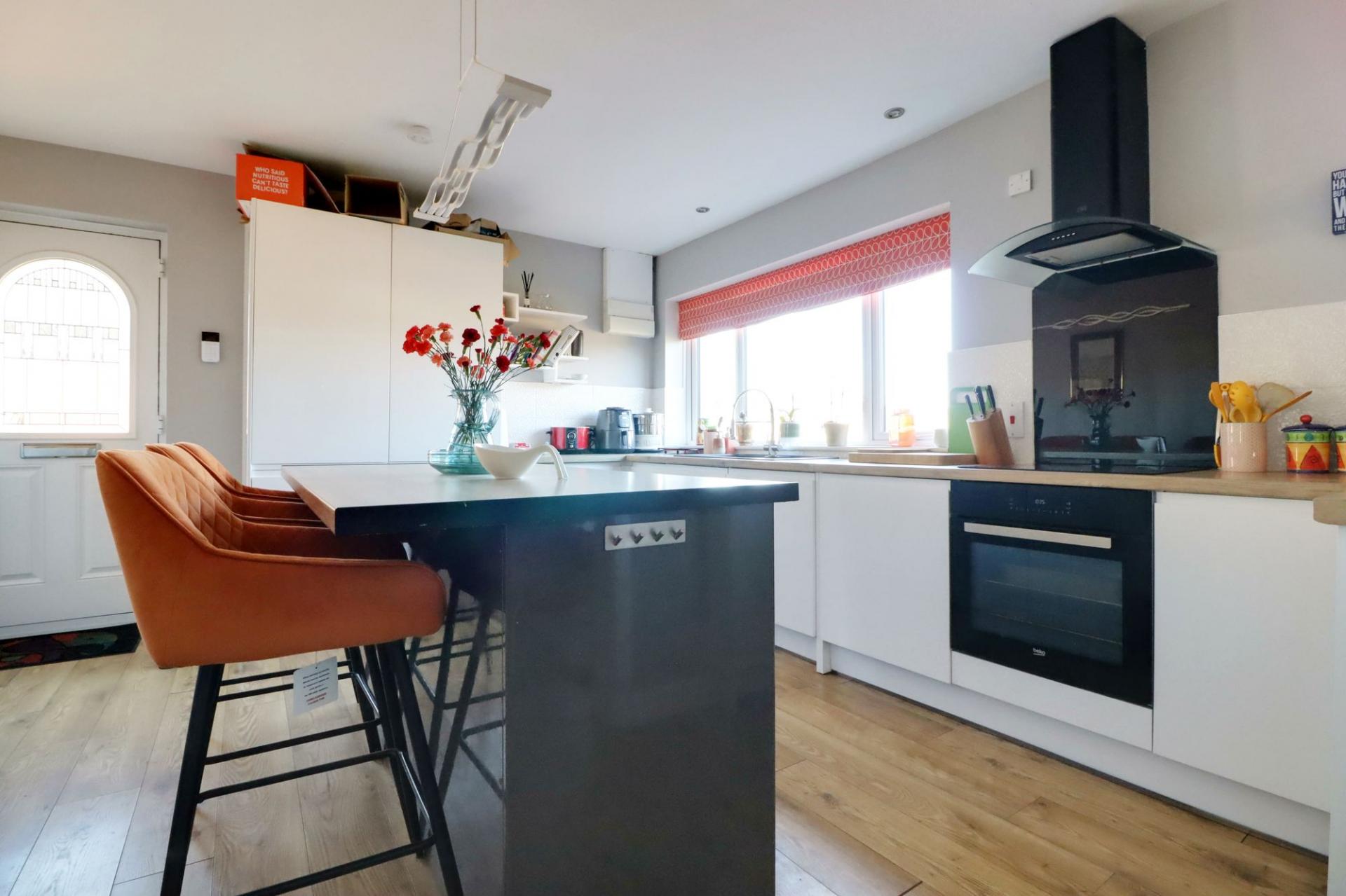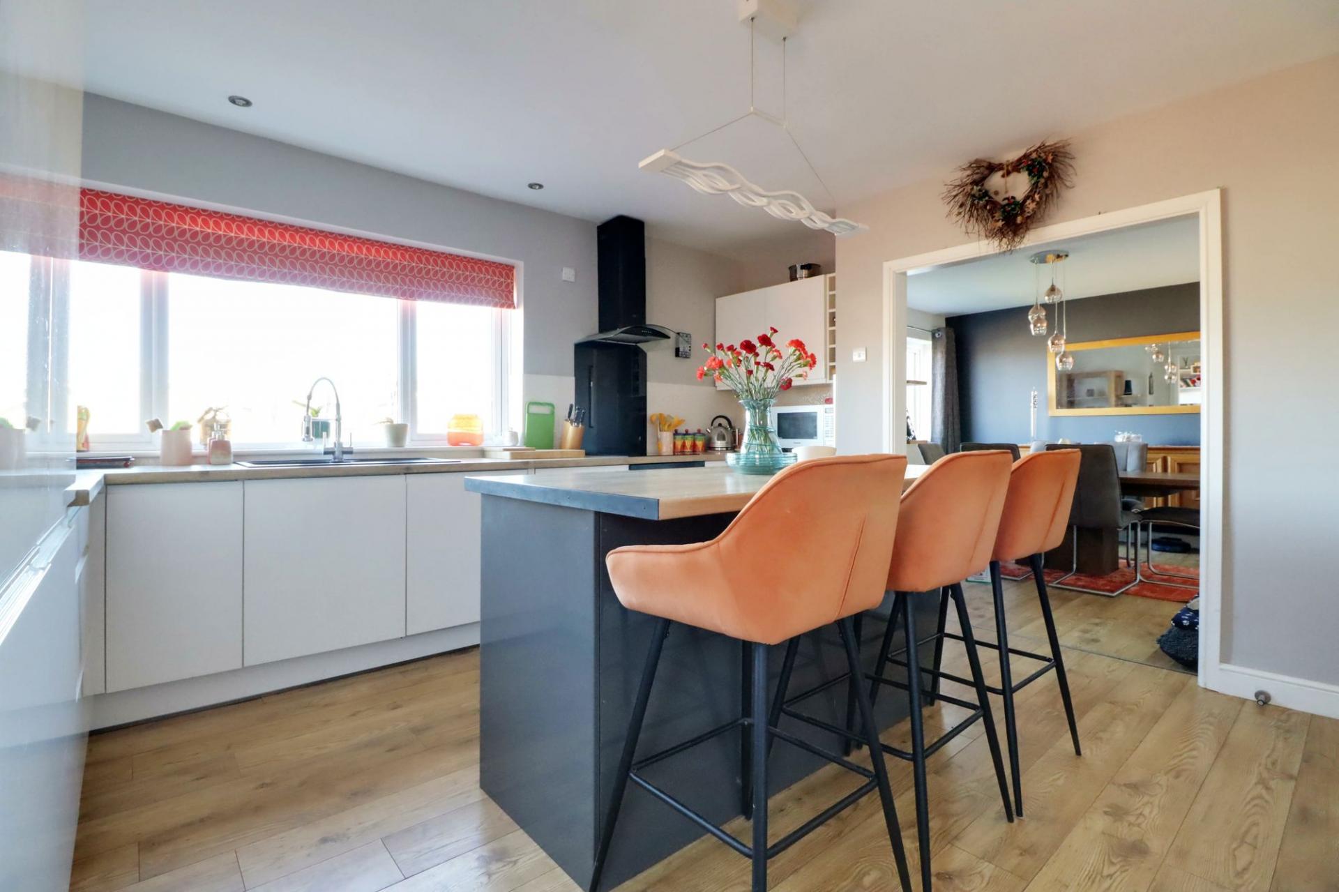 With front uPVC double glazed window, side composite double glazed with patterned leaded glazing. The kitchen enjoys an extensive range of modern handleless gloss finished furniture with a patterned wooden style worktop with tiled splash backs that incorporates a single sink unit with drainer to the side and block mixer tap, built-in four ring electric hob with overhead extractor and oven beneath, integral appliances, central breakfasting island, laminate flooring and broad opening through to;