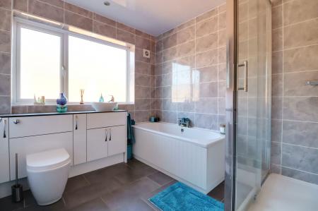 Side uPVC double glazed window with patterned glazing, enjoys the most attactive suite in white comprising a close couple low flush WC, adjoining vanity unit with a decton style top with an oval sink unit, double ended panelled bath and large walk-in shower cubicle with mains shower, tiled flooring, three fully tiled walls, clad finish to ceiling, traditional style cermaic radiator with chrome towel surround and inset ceiling spotlights.