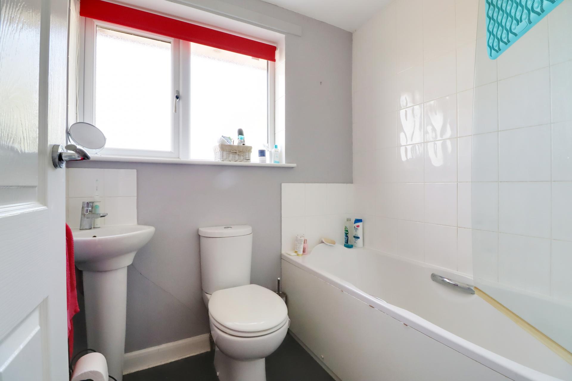 BATHROOM Measures approx. 1.88m x 1.66m (6' 2" x 5' 5") Enjoying a rear uPVC double glazed window with inset pattern glazing and a three piece suite in white comprising a low flush WC, corner fitted pedestal wash hand basin with tiled splash back, panelled bath with shower attachments, shower screen and surrounding tiled walls and extractor.