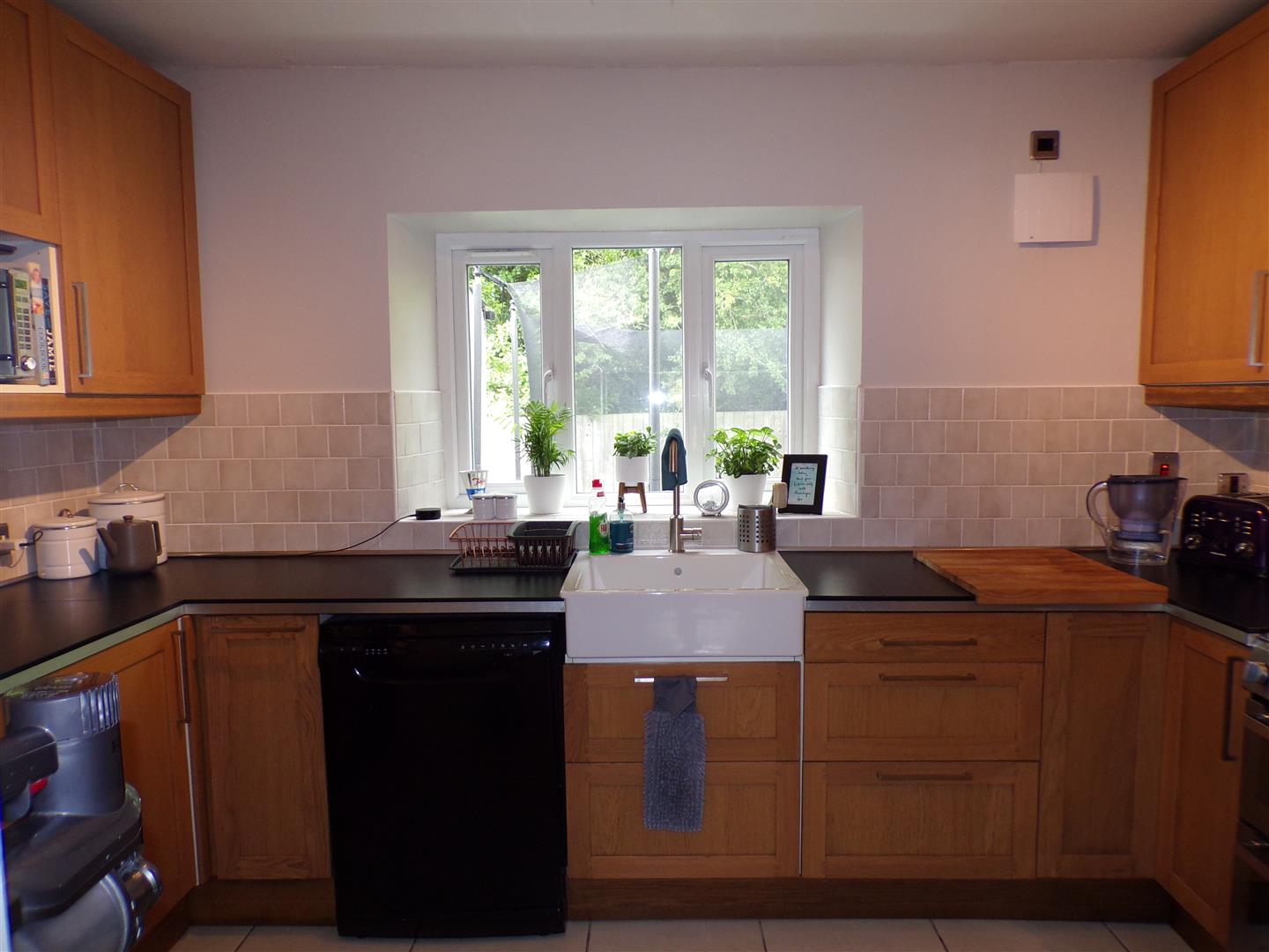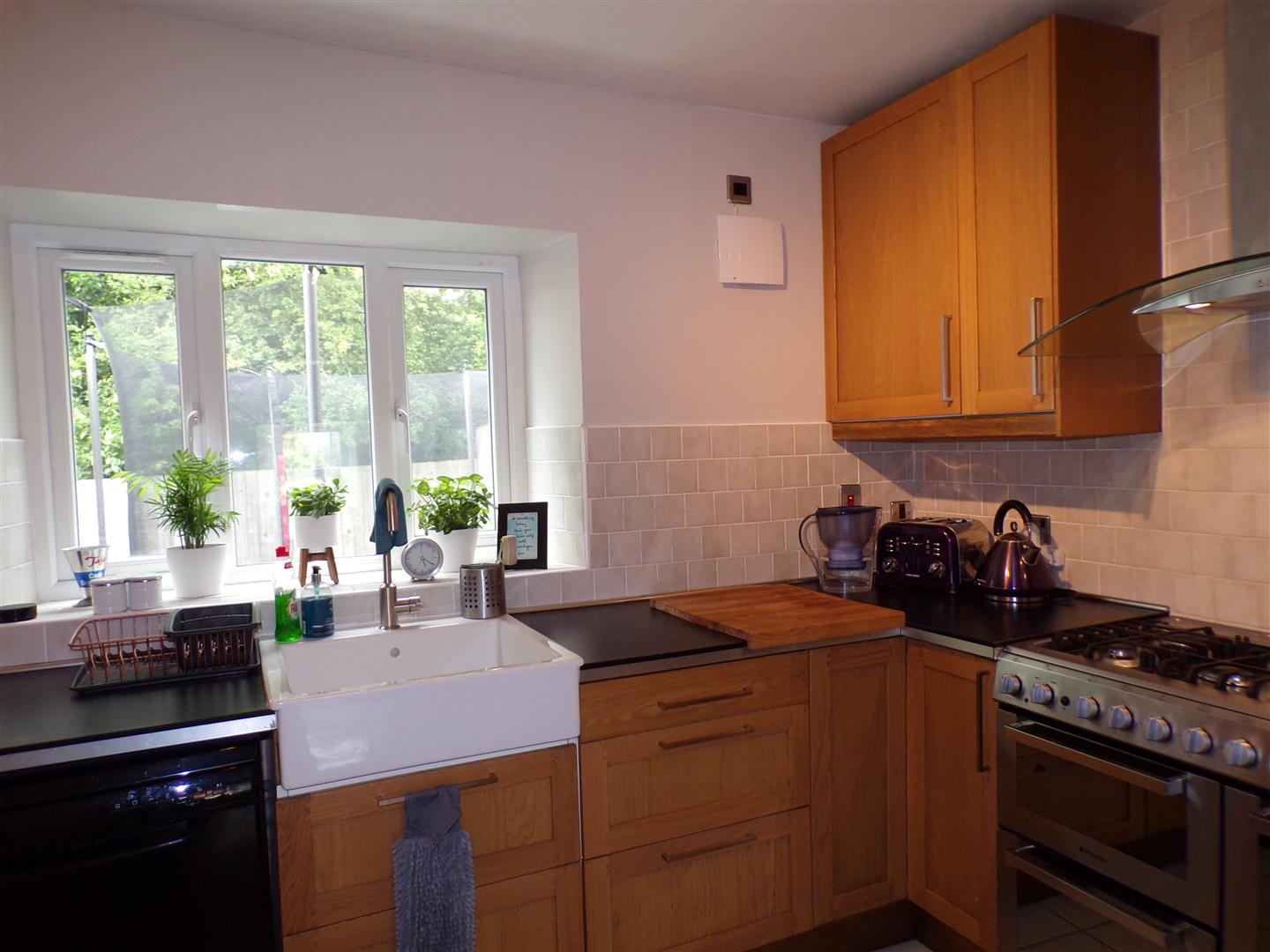 3.66m x 2.26m (12' x 7'5") - Having range of eye and low level units, 'Belfast' sink, 'Hot Point' cooking centre comprising gas hob, two electric ovens, grill and warming drawer, extractor hood, plumbed for dishwasher, space for fridge freezer, tiling between units, tiled floor.