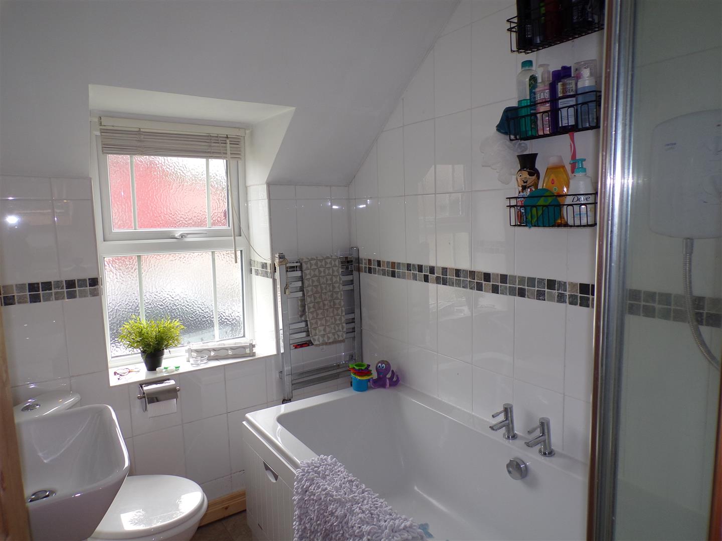 Comprising bath with electric shower over, shower screen, WHB, WC, fully tiled walls.