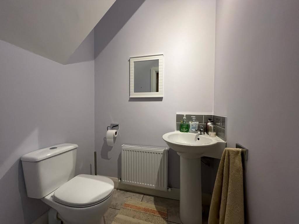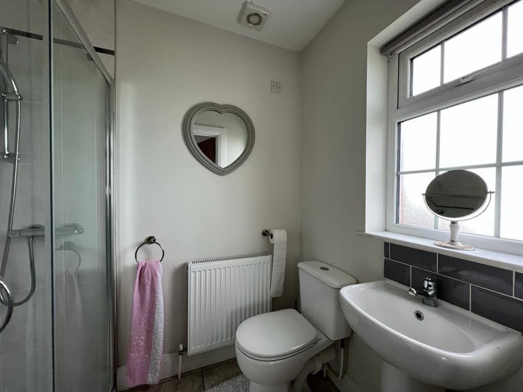 Comprising fully tiled walk in shower, whb and wc, tiled floor.