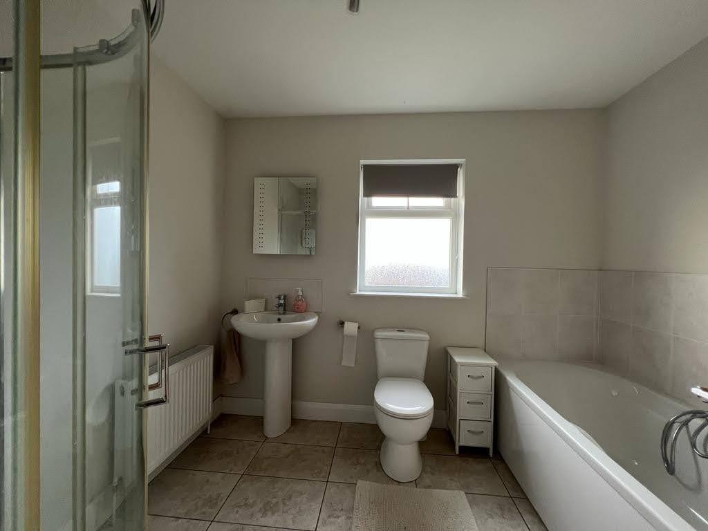 Comprising bath with shower fitting to taps, walk in shower, whb and wc, tiled floor.