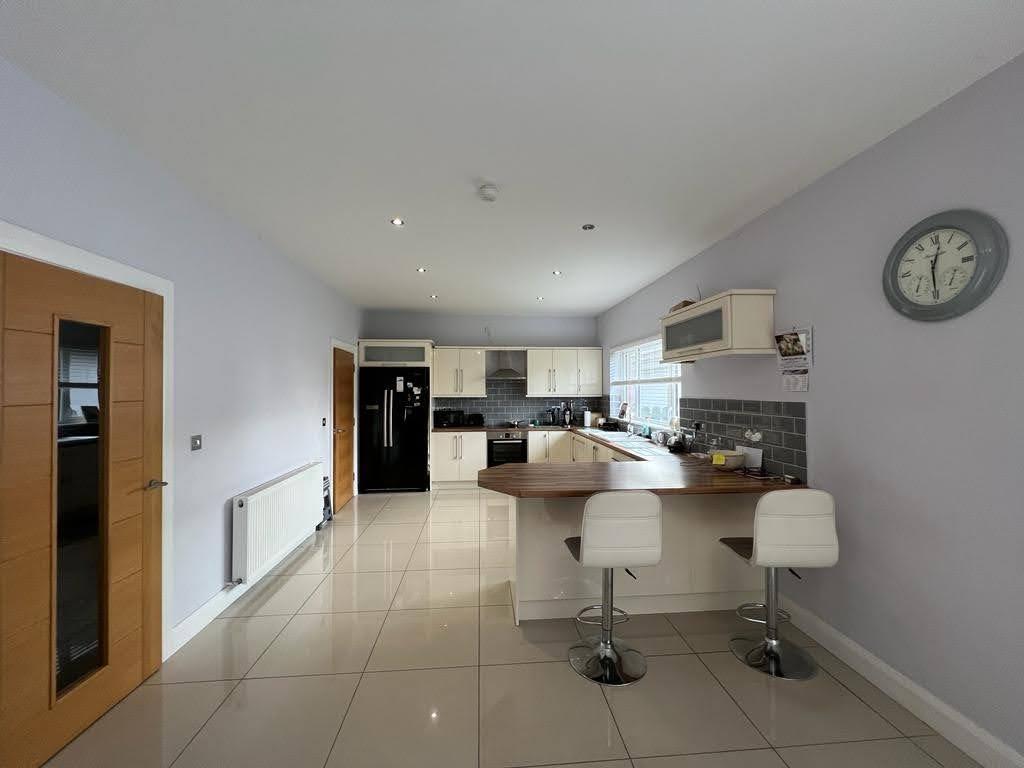 9.25m x 3.68m (30'4" x 12'1") - Having excellent range of eye and low level units, tiling between units, hob, underoven, stainless steel extractor hood, integrated dishwasher, space for fridge / freezer, breakfast bar, recessed lighting, tiled floor, ample dining space with sliding patio doors leading to rear lawn.