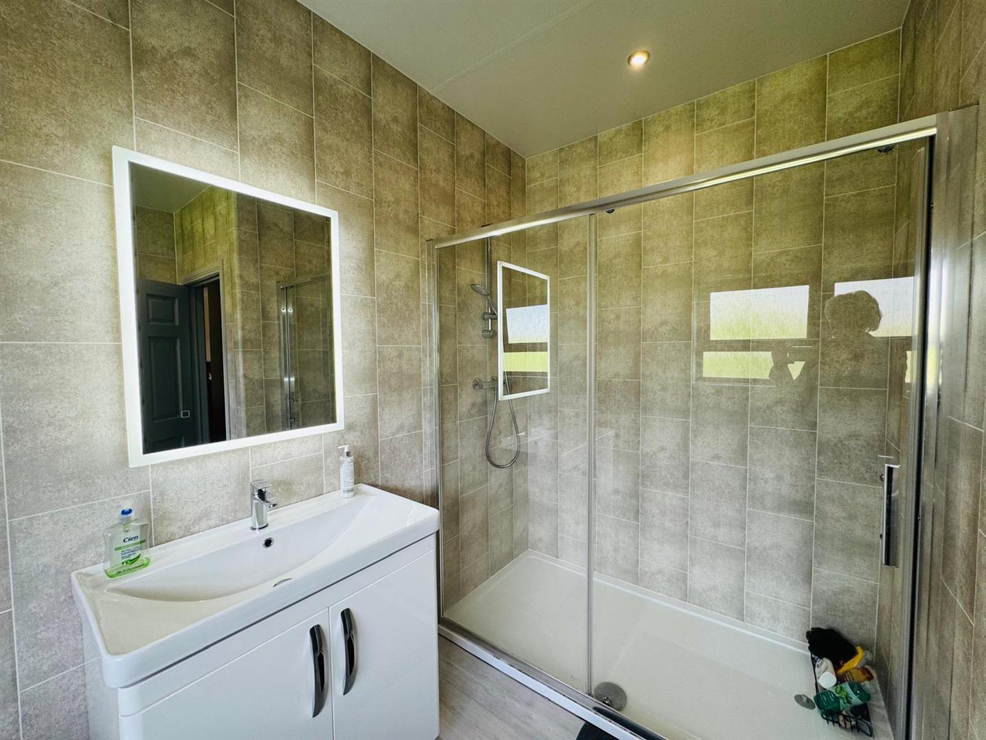 Comprising bath with mixer taps, whb set in vanity unit, wc, walk in double width shower, recessed lighting, PVC cladding to walls, laminated floor.