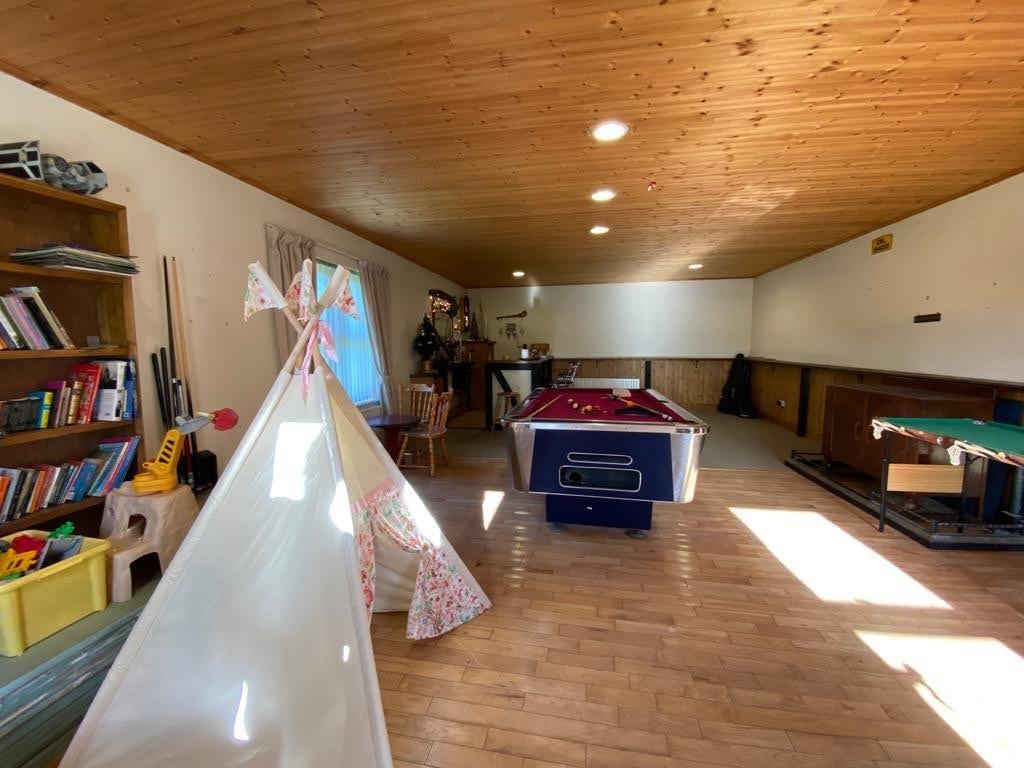 WORKSHOP / BAR 30' x 18'2" Having recessed lighting, part wooden floor, partly wooden panelled walls.