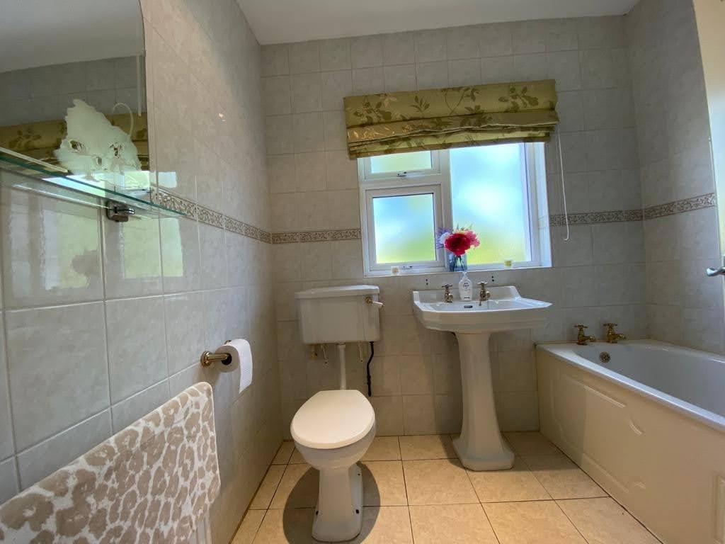 Comprising bath, whb and wc, recessed lighting, fully tiled walls and floor.