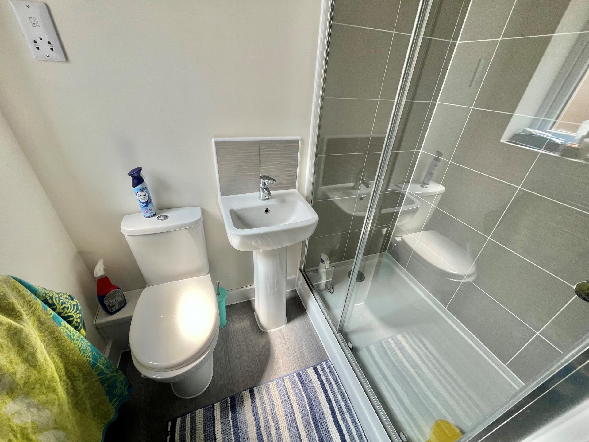 ENSUITE SHOWER ROOM 4' 5" x 6' 3" (1.36m x 1.92m) 1200mm shower cabinet, low level WC, wash hand basin, obscure glazed UPVC window, radiator, shaver point.