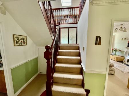 ENTRANCE HALLWAY 12' 7" x 15' 7" (3.86m x 4.77m) With skimmed and coved ceiling, 2 x decorative ceiling rose, 2 x centre light points, dado rail, understairs storage cupboard, BT point, single radiator, alarm controls, stairs leading off to the first floor galleried landing, door off entrance hallway leading into: