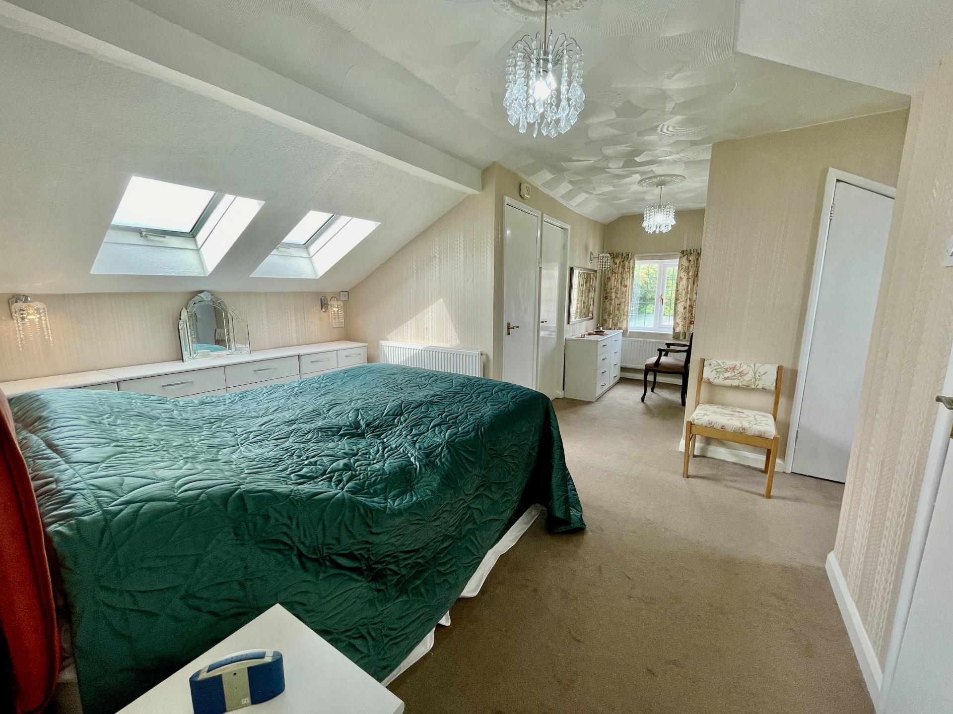 MASTER BEDROOM 19' 4" x 20' 2" (5.9m x 6.17m) With UPVC double glazed window to the front and side elevations, 2 x fitted Velux roof windows to the rear elevation, textured ceiling with 2 x centre light points, smoke alarm, walk in wardrobe (1.36m x 2.19m) with lighting and hanging rail, further walk in wardrobe (2.14m x 2.46m) with hanging rail and lighting, further storage cupboard into eves, further storage cupboard off with shelving, 3 x wall lights, TV point, 2 x single radiators.