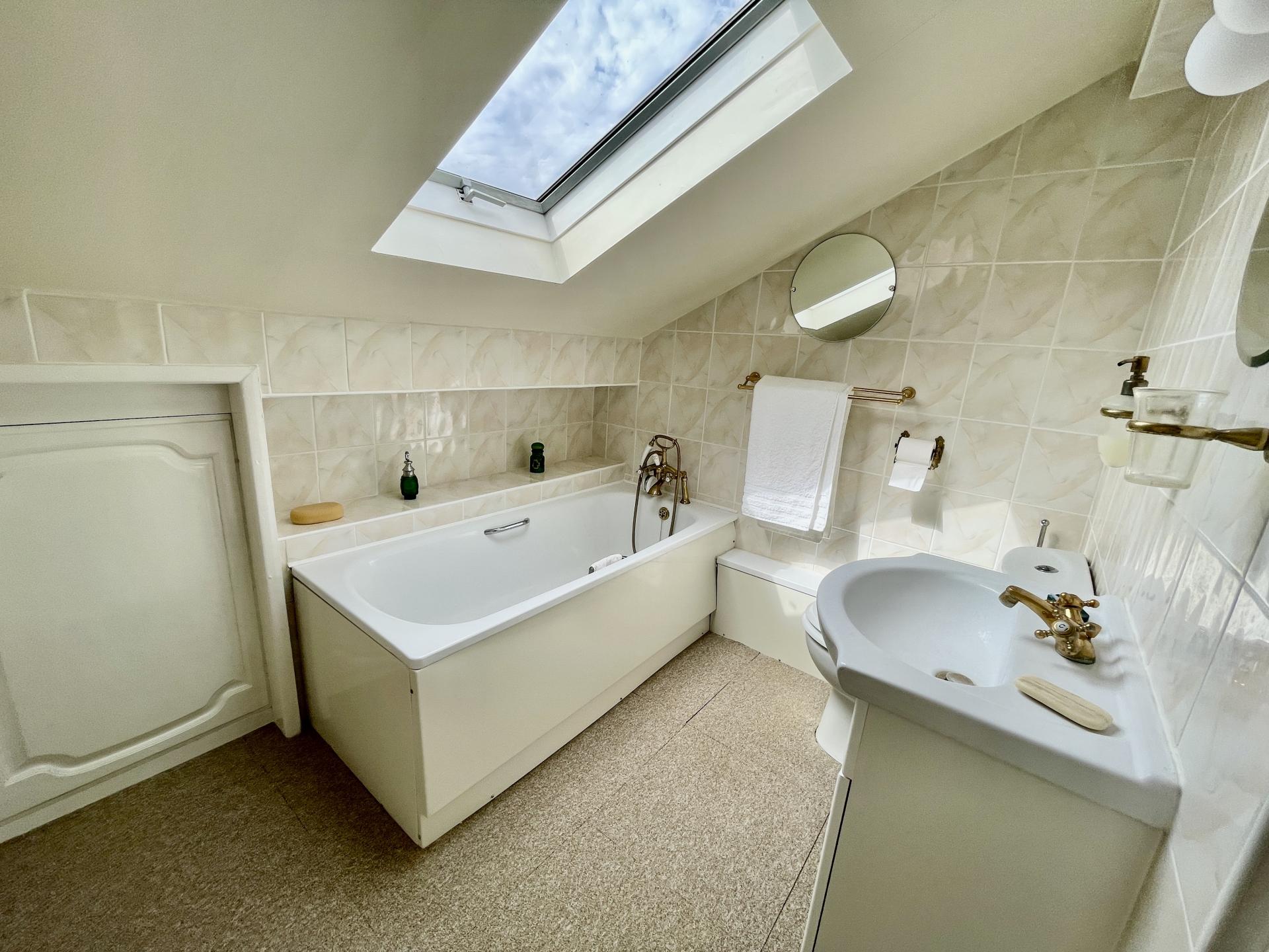 MASTER ENSUITE 5' 11" x 8' 2" (1.82m x 2.49m) With fitted Velux window to the rear elevation, skimmed ceiling, fully tiled walls, fitted wall lights, fitted with 3 piece suite comprising low level WC, wash hand basin fitted into vanity unit with storage below, mixer tap, bath with telephone shower mixer tap. Loft access.