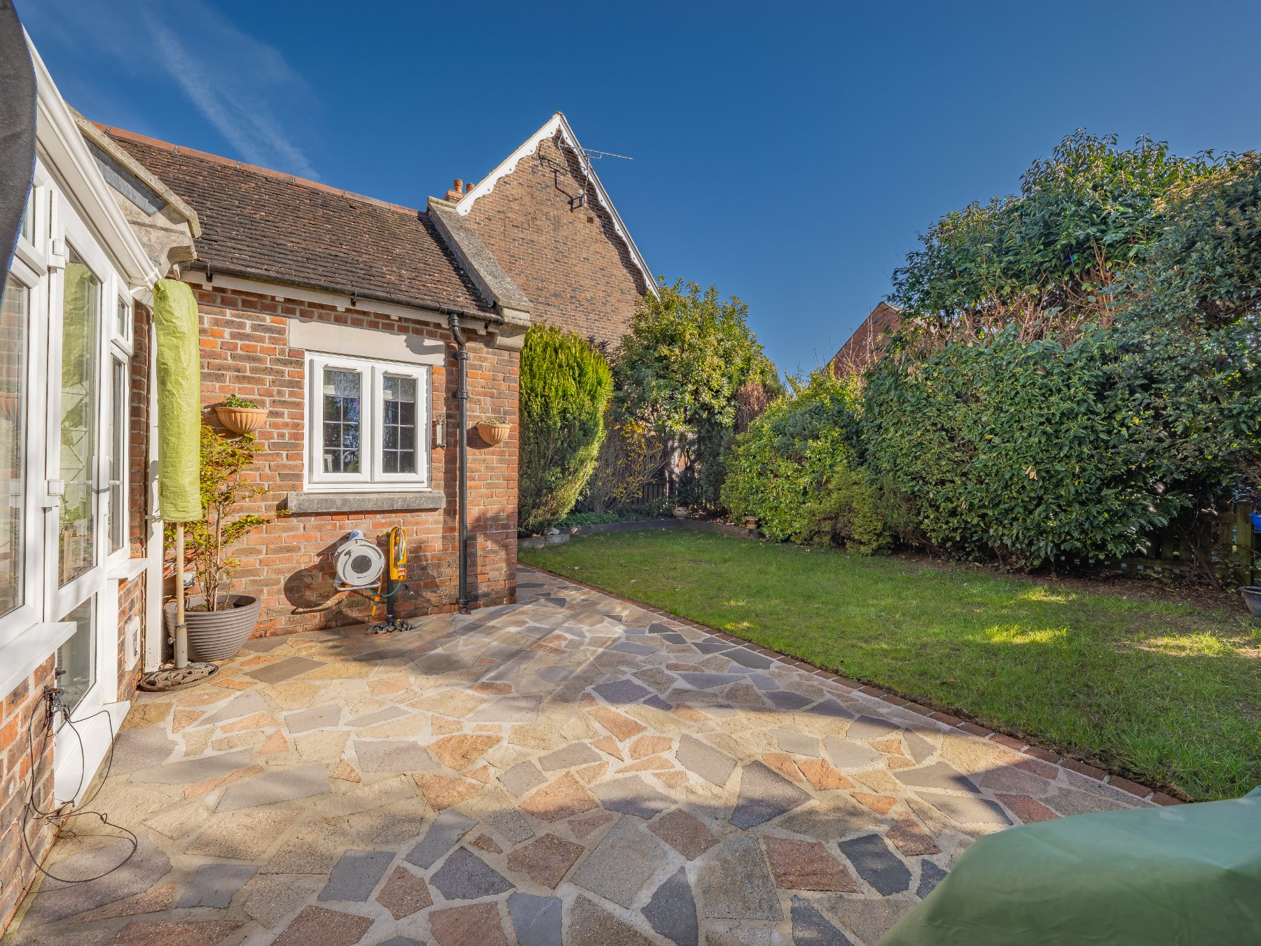 A paved patio wraps around the sun room, providing a seamless extension of the living space and an ideal setting for outdoor dining and entertaining. Tucked neatly around the corner, a further seating area offers an additional place to sit and enjoy the surroundings. Practical features include an outside tap for added convenience, a useful storage shed and gated side access, along with pedestrian access via a shared footpath.