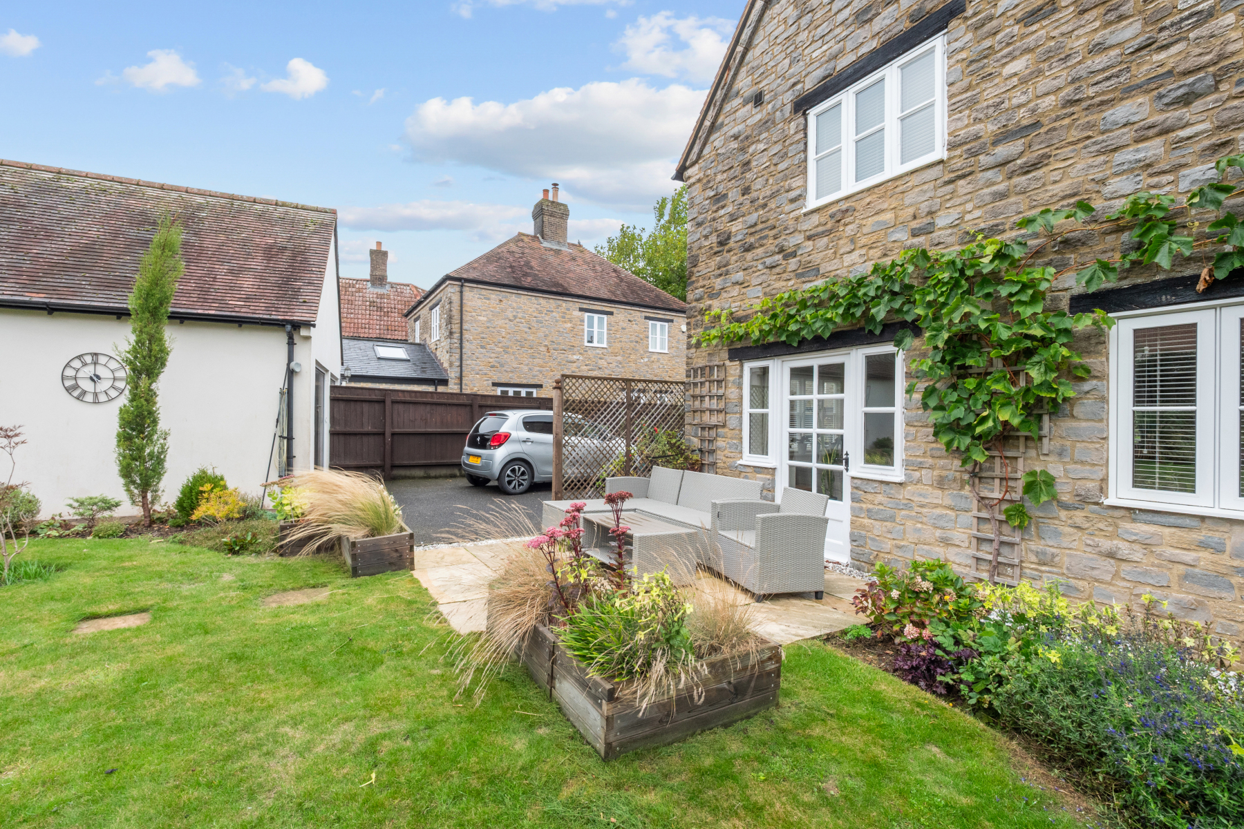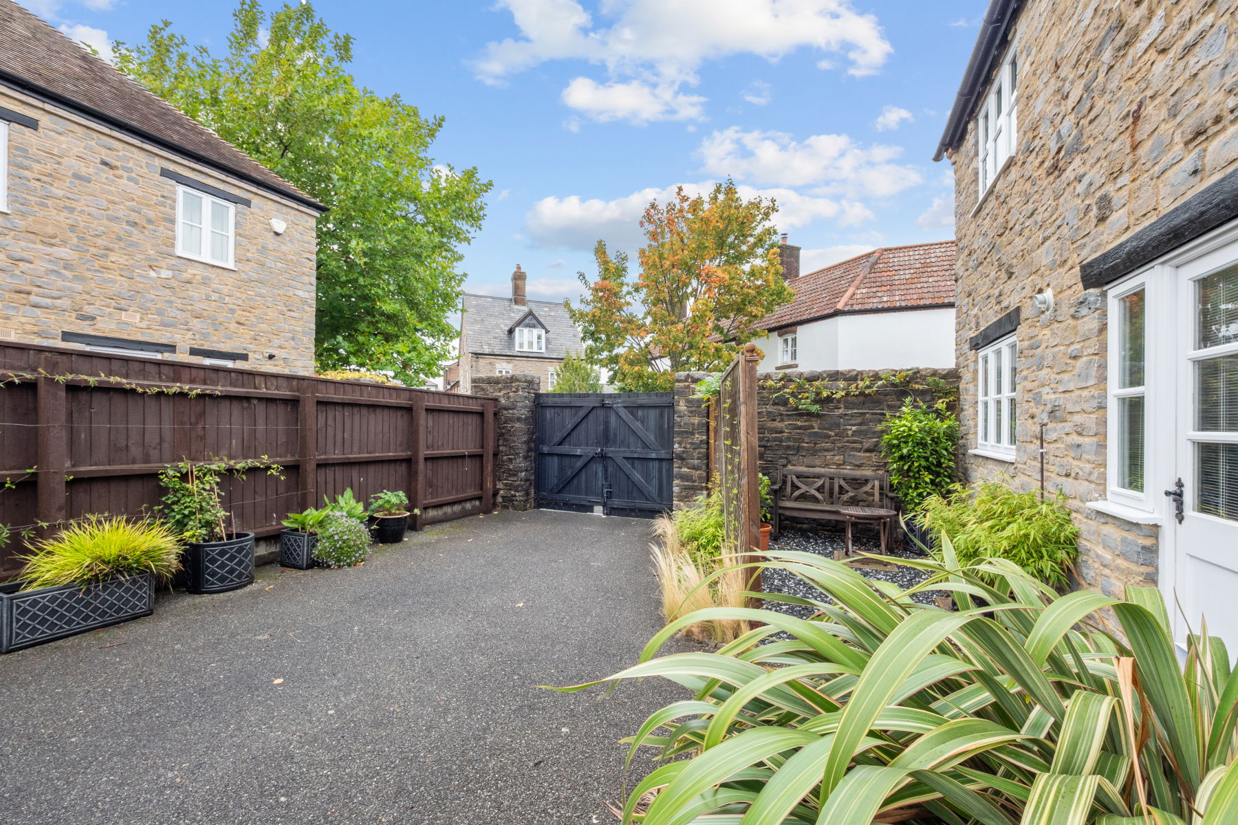 To the side of the house, double timber gates open to a tarmac driveway with space for several cars, leading to a tandem garage that provides further parking or valuable storage. Together, the enclosed garden, gated driveway, and garage combine practicality with charm, making the outside space as appealing as the home itself.