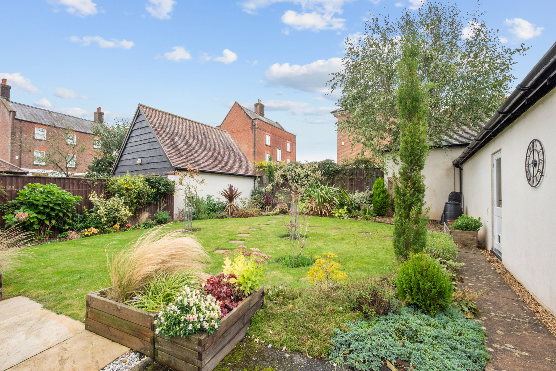 Immediately adjoining the sitting room is a paved terrace, perfectly positioned for outdoor furniture and ideal for enjoying a morning coffee or evening drink while overlooking the garden. Beyond, the space opens to an area laid to lawn, planted with saplings and bounded by an established border of richly planted mature shrubs and flowers which add seasonal colour and interest.