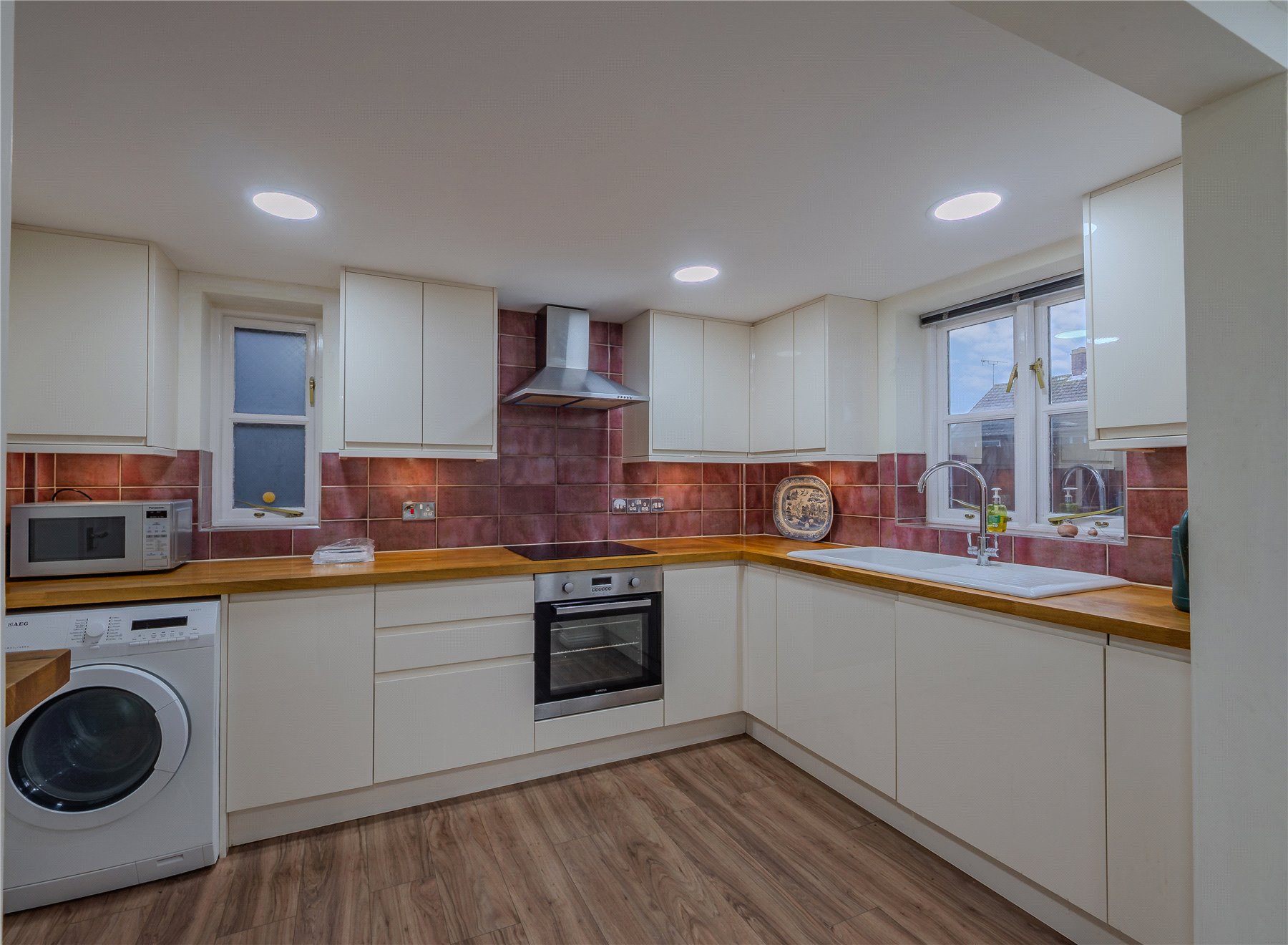 The fitted KITCHEN features a range of wall and floor mounted units finished in a contemporary white gloss effect, complemented by wooden worktop surfaces. Integrated appliances include a single oven, electric hob with cooker hood over and a dishwasher, while there is also plumbing and space for a washing machine. An opening between the kitchen and dining room creates an open plan feel, making this space perfect for hosting dinners and social occasions.
