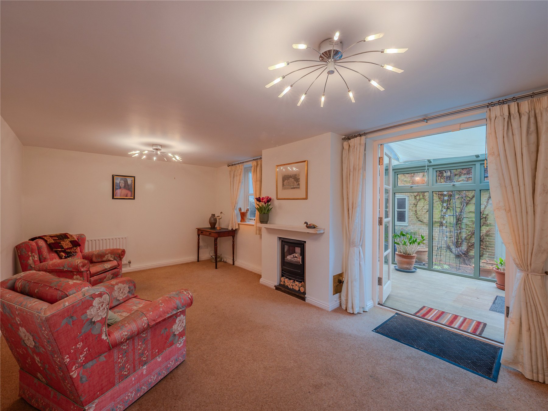 Sitting room with log burner and conservatory