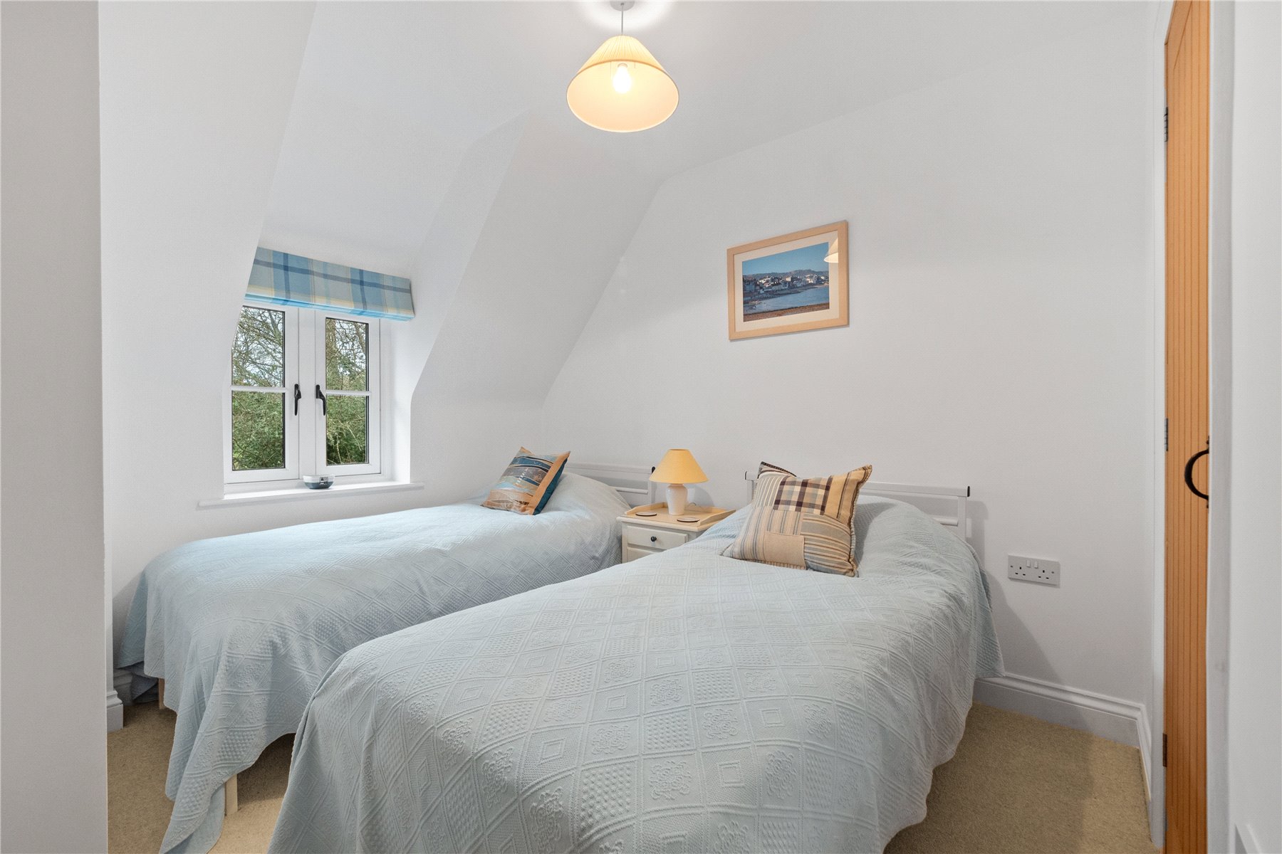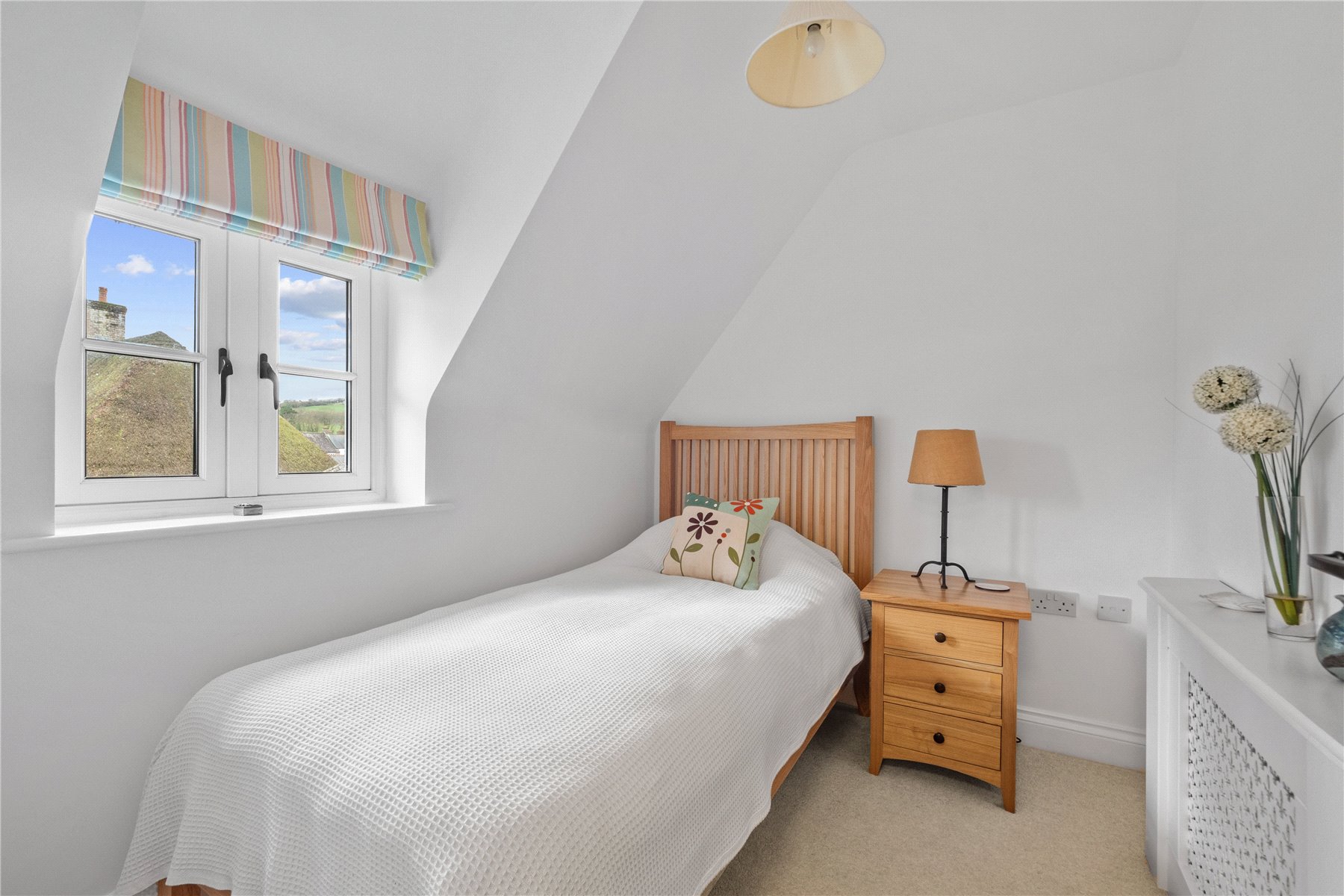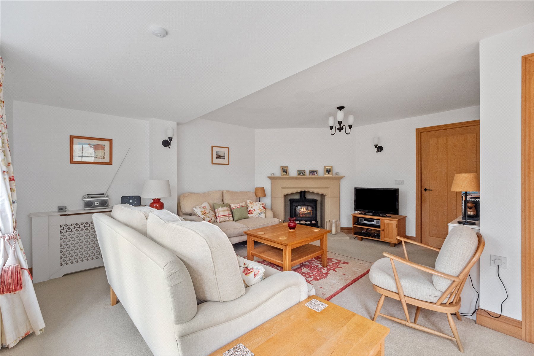 To the rear, the SITTING ROOM is a bright and comfortable space, enhanced by large windows overlooking the courtyard garden and communal grounds beyond. A gas fired wood burning stove is set within a stone surround and hearth creating an attractive focal point and providing a welcome warmth during cooler months. An understairs cupboard offers additional storage and houses the gas boiler. A door provides direct access to the courtyard garden, allowing for a seamless connection between inside and out.